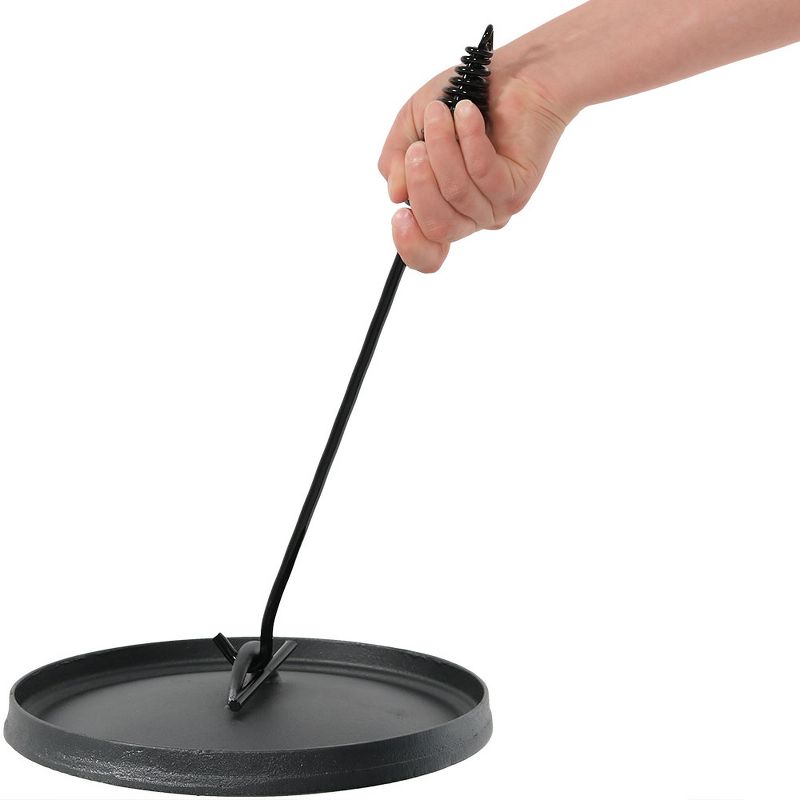 Keep a safe distance from the camp fire by using the Sunnydaze 16.5" Heavy-Duty Cast Iron Dutch Oven Lid Lifter. Featuring a 4" wide "T" bar design, the Dutch Oven lid lifter is perfect for lifting a hot lid off of a dutch oven and also comes in handy when trying to move, rotate or maneuver hot cookware. The durable cast iron spiral bail handle makes grasping the lid lifter more comfortable. This durable lid lifter can safely lift a lid weighing up to 7 lbs. Like all Sunnydaze Decor products, this lid lifter comes backed by a 1-year manufacturer's warranty for worry-free purchasing. - IMAGE SLOT 4 REPRESENTS PRODUCT IN NIGHTTIME ENVIRONMENT