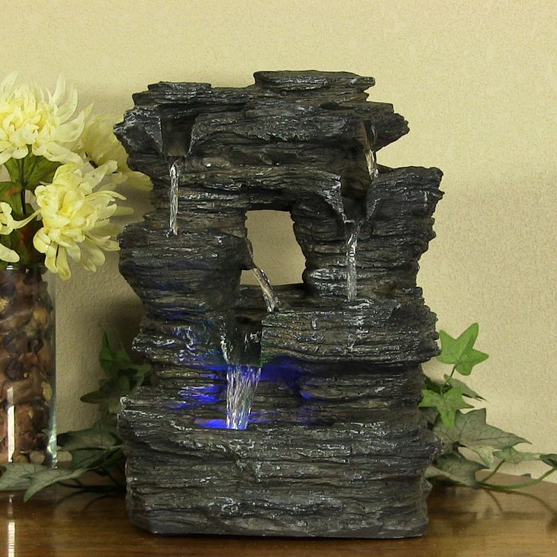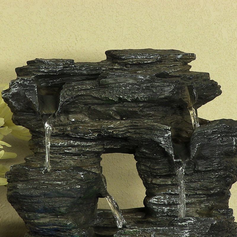 Add this tabletop water fountain to any home's interior design for a beautiful, natural accent. The flowing sounds of the rushing water are sure to instantly relax guests and loved ones while adding a unique decor piece. Water flows from the top, down the multiple tiers to the bottom pool where it recirculates with help from a submersible electric pump. Plus, there are 4 colored LEDs in the light located in the bottom basin, one red, one yellow, one green and one blue light! Because of the electric pump, no plumbing is required, simply add water, plug it into a standard electrical outlet indoors and it is ready to go! - IMAGE SLOT 4 REPRESENTS PRODUCT IN NIGHTTIME ENVIRONMENT