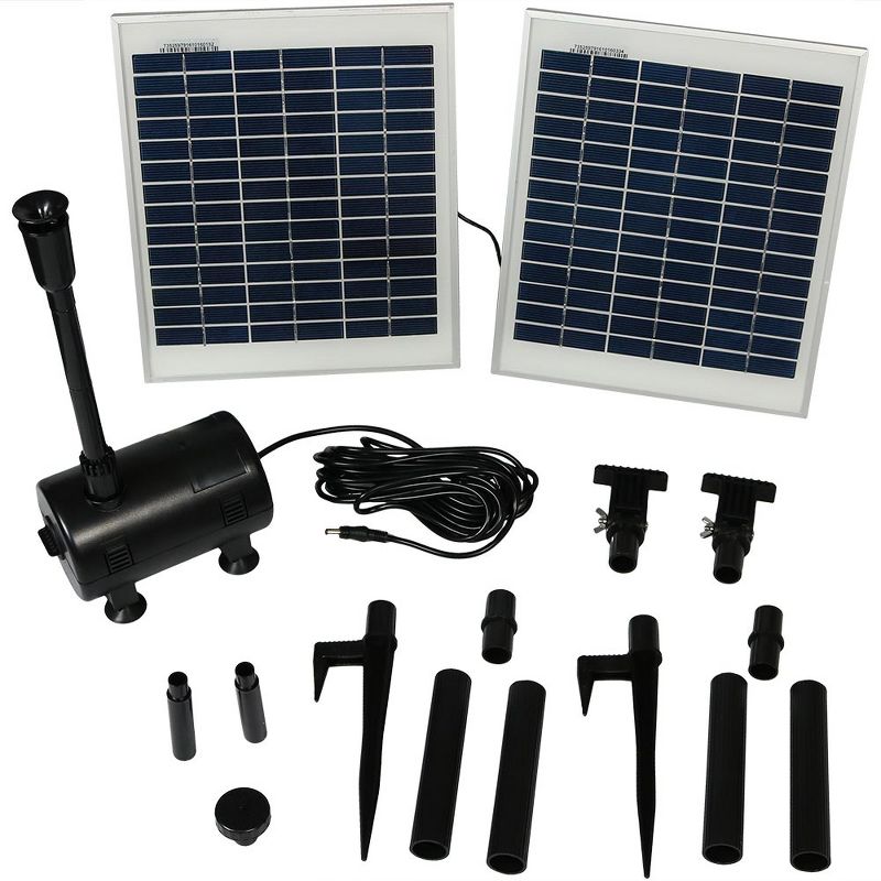 • 2 solar panels, brackets, ground spikes, spray heads, pump and 16' cable