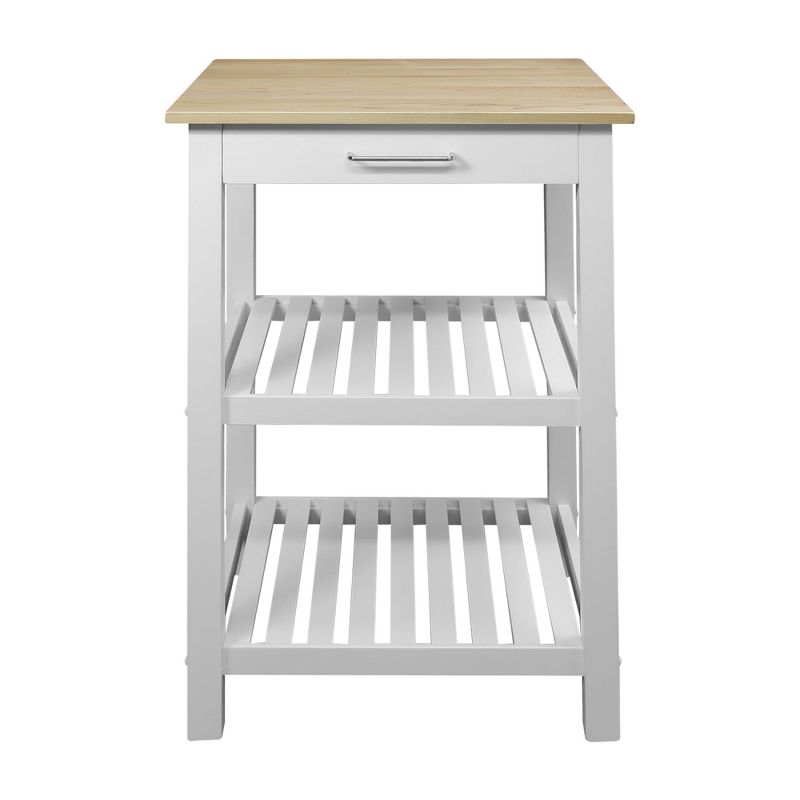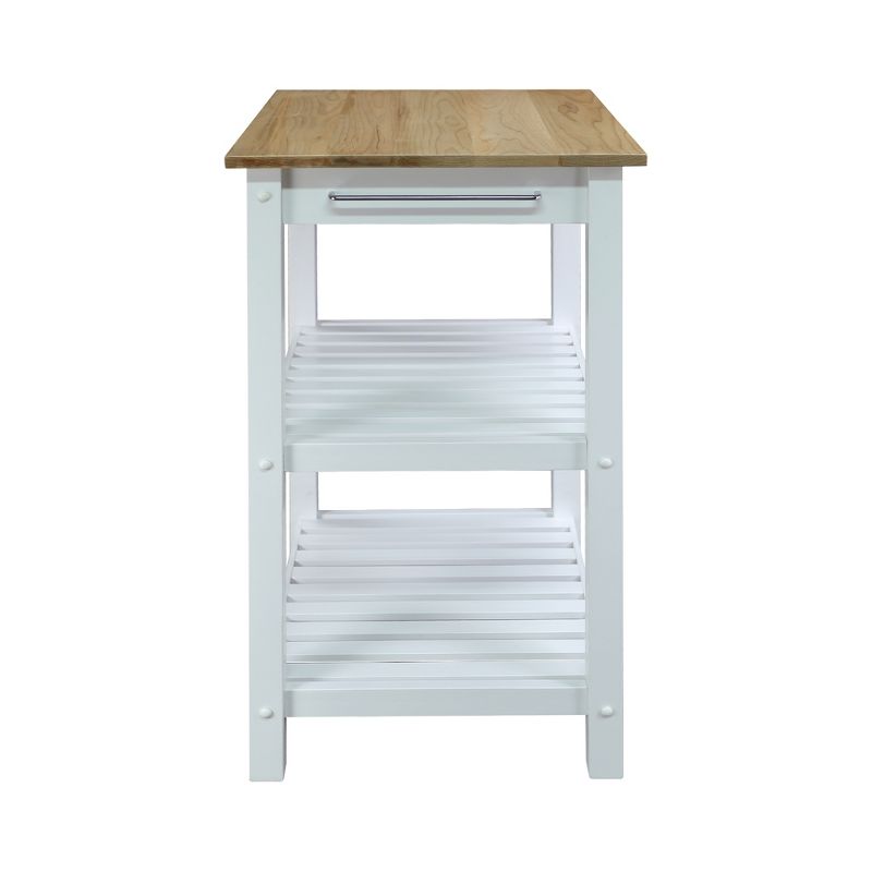 Designed for tighter spaces and those who value extra counter space, our American Trails Sunrise Kitchen Island (Small) with Solid Maple Top is the perfect companion to start any project in the kitchen. Its two-tone neutral color design gives it a modern appeal that highlights the natural beauty of the American Maple top while complementing any current home decor. The smooth sliding drawer and 2 lower slatted shelves provide plenty of space to store everyday essentials or the supplies of today's recipe or project. The side even features a stainless steel towel rack for convenient hanging or decoration. Solid American Maple and solid wood construction ensure a sturdy construction and years of lasting beauty that can withstand everyday use.