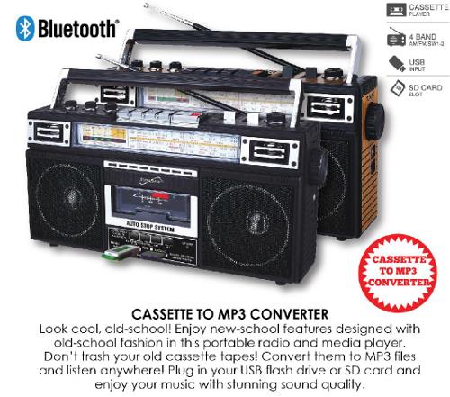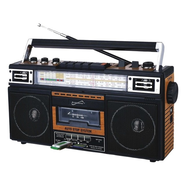 The Supersonic SC-3201BT is a Retro 4 Band Radio and Cassette Player with Bluetooth for audio streaming from Bluetooth-compatible devices. This black throwback beauty can receive AM and FM radio plus shortwave 1-2 World Band Receiver. It also has built in USB and SD Card ports to play back digital audio files. It can also convert analog music to digital music files from its built in cassette player.