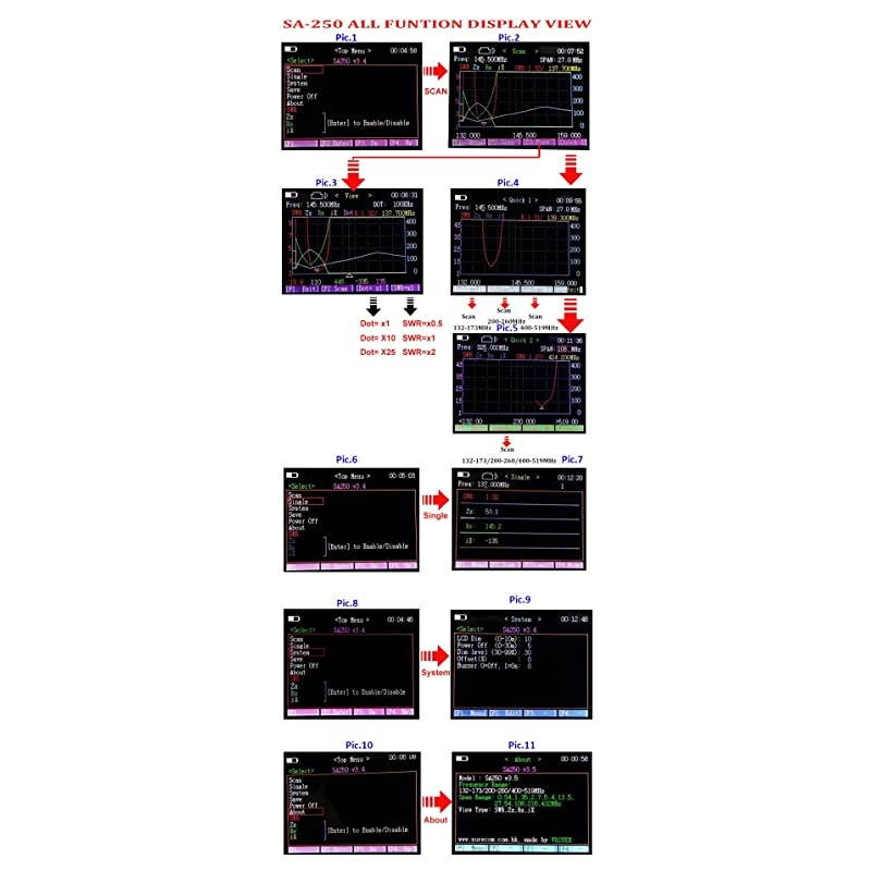 Descriptions: - 2.2 precision LCD screen, High-lumen LCD brightness, easy to read in direct sunlight - Heavy duty Aluminum enclosure, strong anti-interference ability. - Very compact and convenient for field use - Built-in rechargertable battery - Full Band control by knob ( 132-173Mhz / 200-260Mhz / 400-519MHz) - Easy setup, only four control buttons with convenient on-screen soft menus - Constant Battery Status Indicator and Auto Shut-off - Built-in timer shows elapsed time when unit is turned on - High efficiency IC, low power consumption, the longest working hours - More choice measurement frequency Span. - One botton quick scan mode (V1, V2, U) or 3 band by full screen. - Auto marker the low s. w. r.