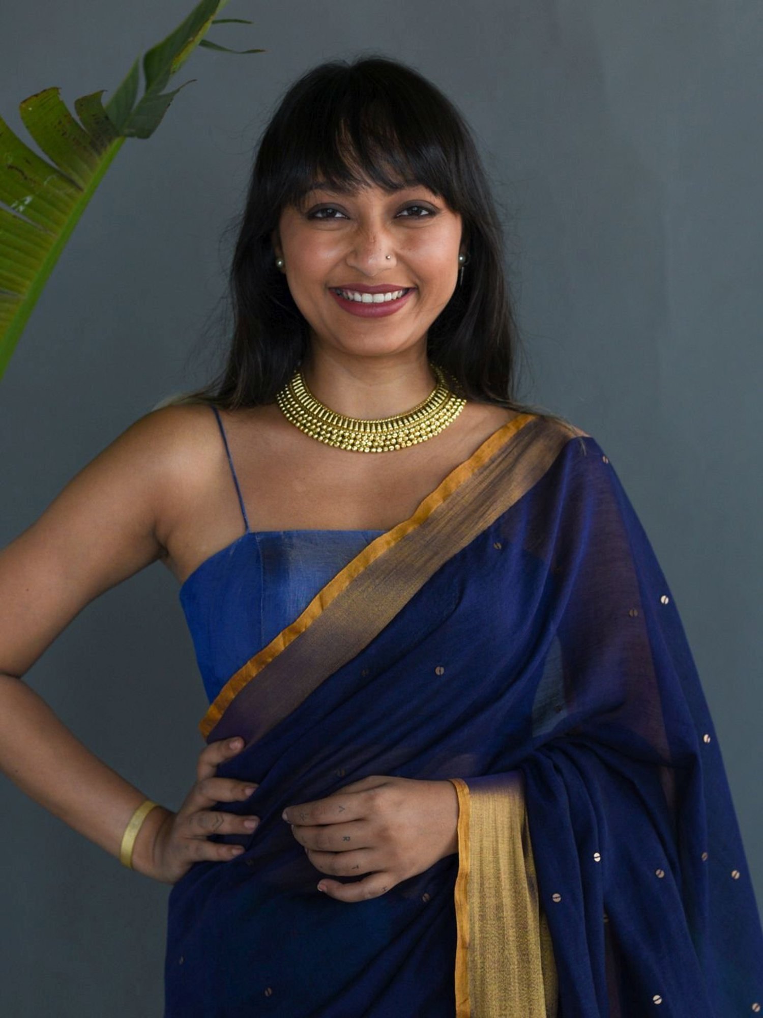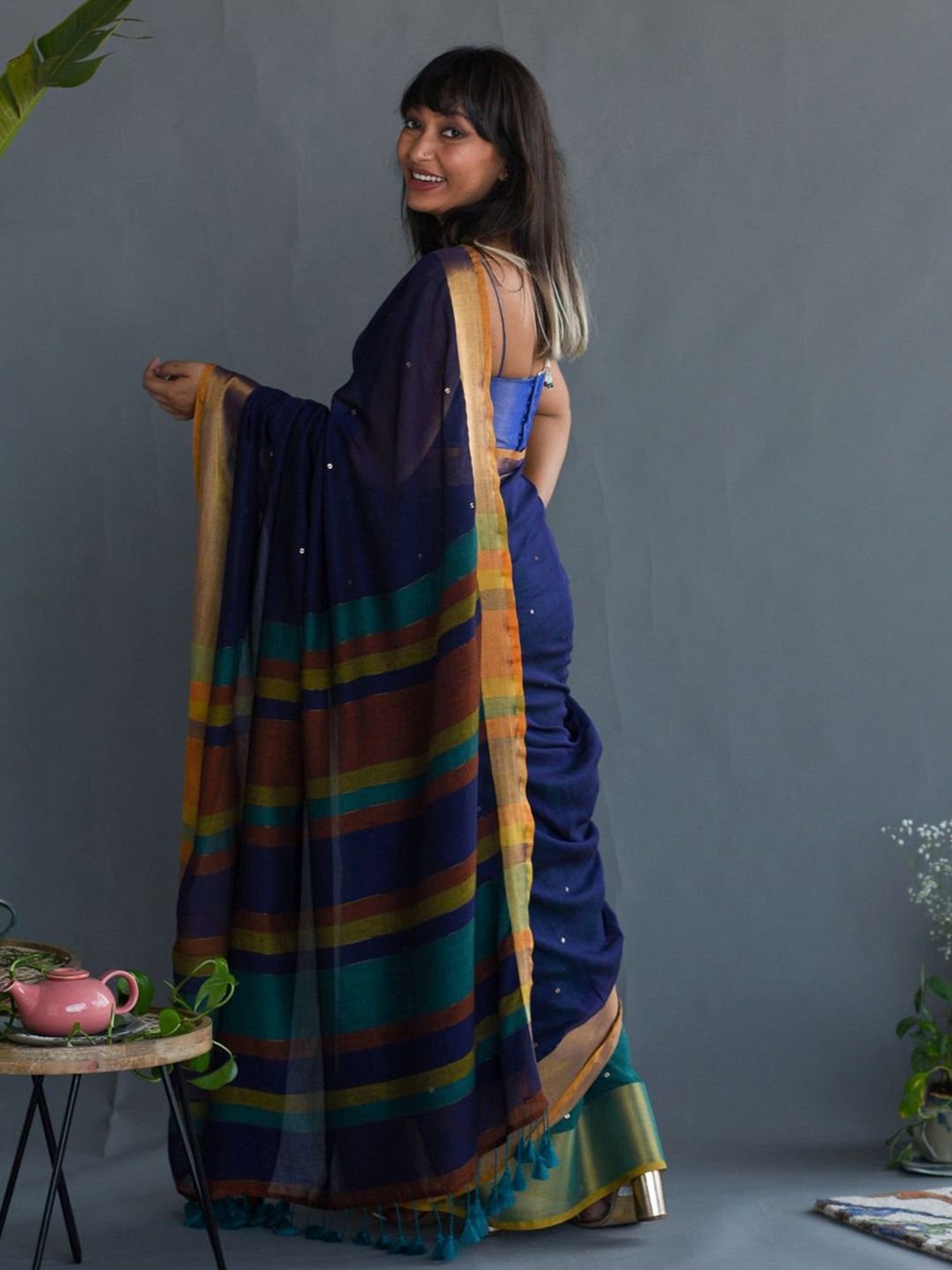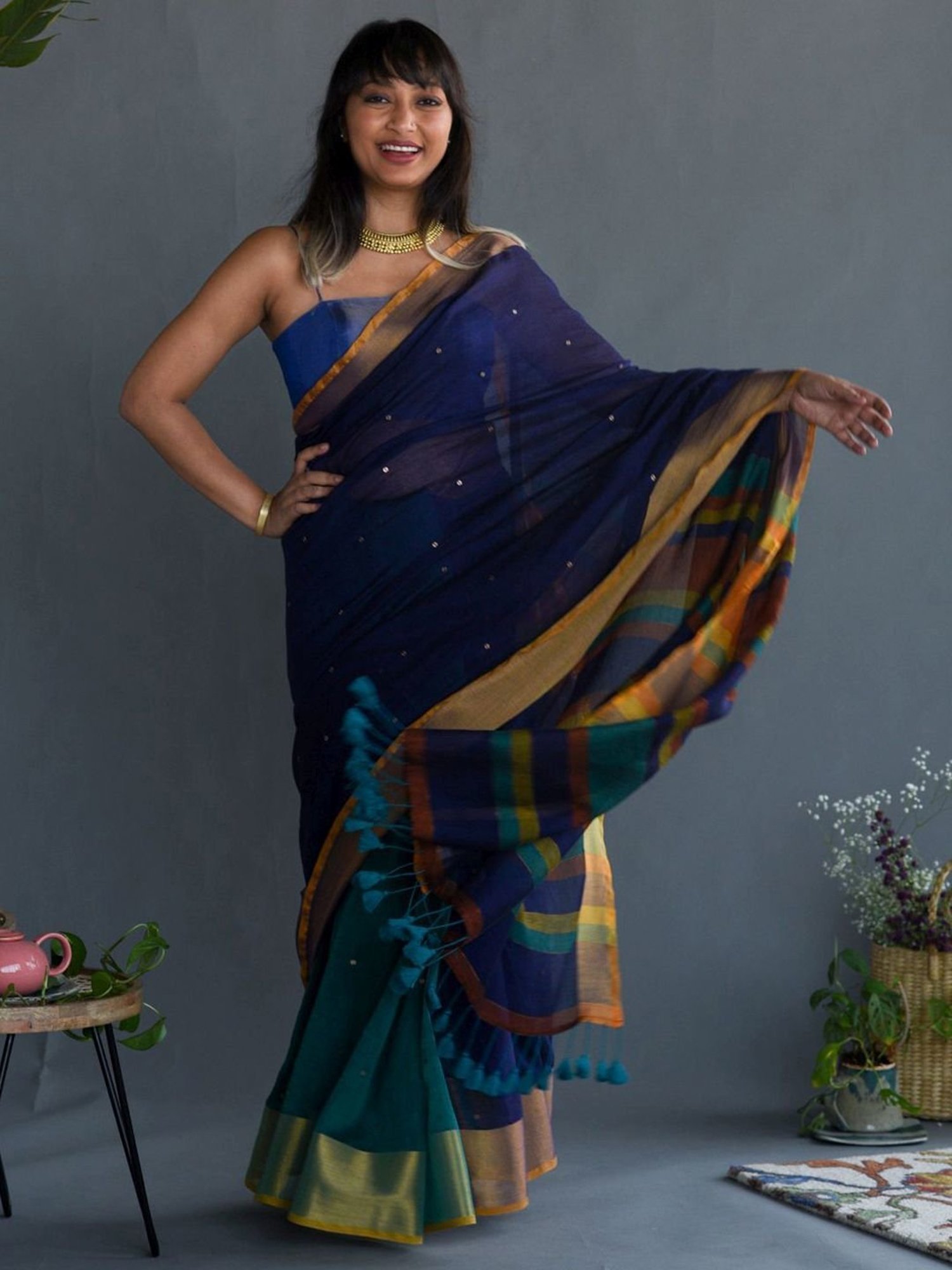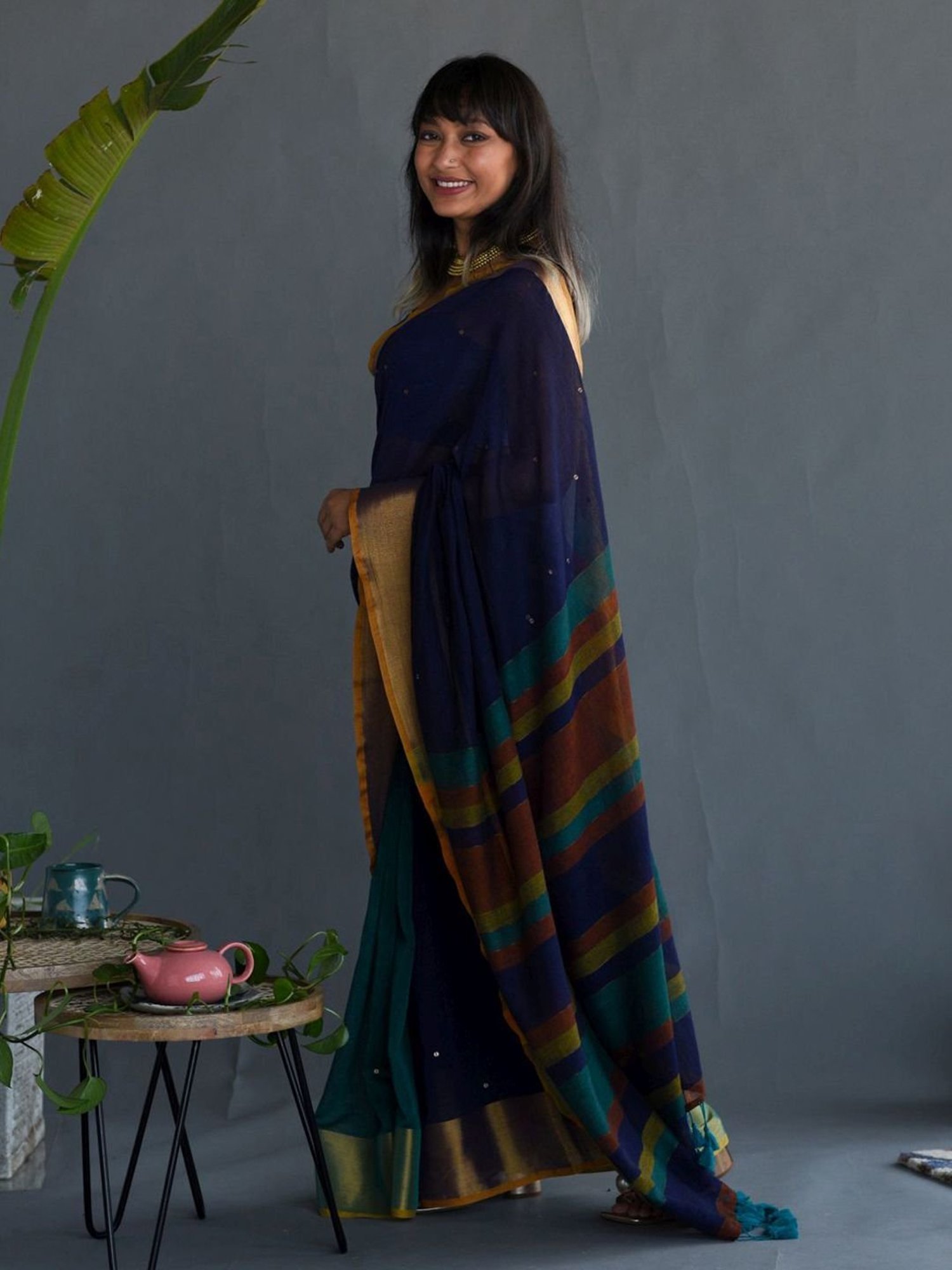 Add a dash of finesse to your semblance by donning this navy saree from Suta. Tailored to sartorial perfection from premium quality fabric, it assures a soft and soothing touch against the skin. The embellished pattern makes it an eccentric choice. It has a length of 5.5 meters and width of 1.1 meters.