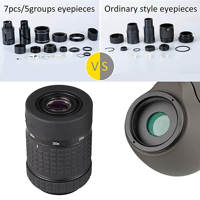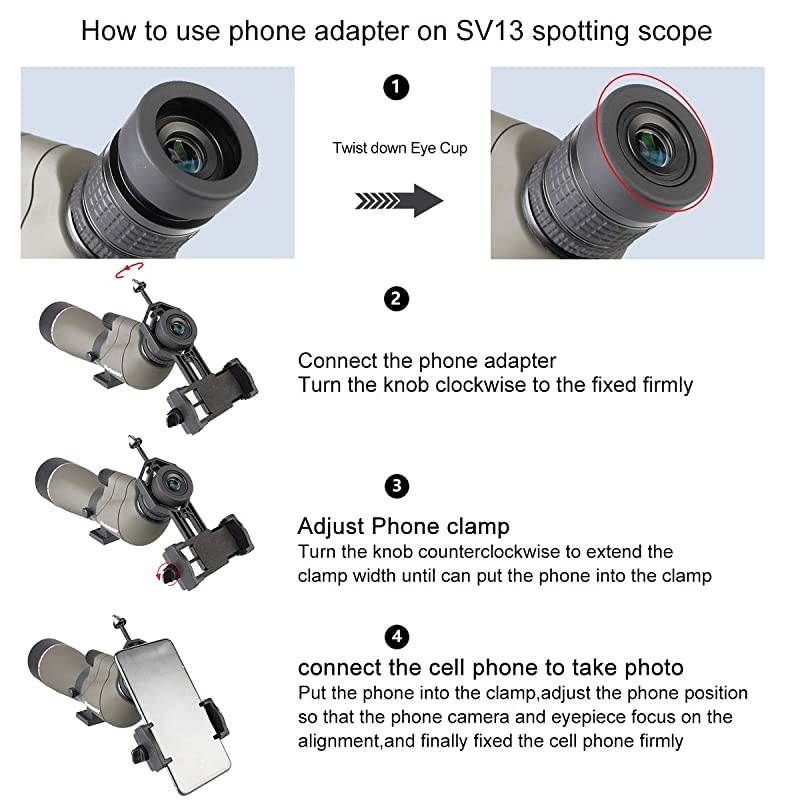 **********SV13 spotting scope with 20x to 60x magnification and 80mm objective lens allows an optimal bright; 82.9 ft - 48ft /1000yds wide angle of view; SV13 shooting spotting scope easily gather more extra light than small aperture; the image is brighter; (with phone adapter in the package) *****FMC lens and Bak4 superior anti-reflection film confirm super light transmission and brightness; SV13 spotting scope with equipped with a silver reflective film, which can can make more the light reflect to the eyepiece*****IPX7 waterproof and fogproof bird watching scope; The waterproof spotting scope manufactured from waterproof material ideal for any weather conditions; rubber armor covering protect the scope from harsh weather*****Adjustable viewing angle shooting spotting scope; loosen the knob to adjust angle of view to a comfortable position; then tighten the knob to make sure fast correct focus*****Aiming wire help you aim at the target; All-metal triangular bracket hole design solves the long-