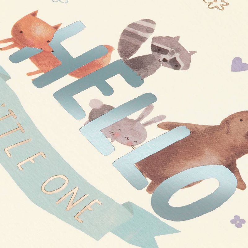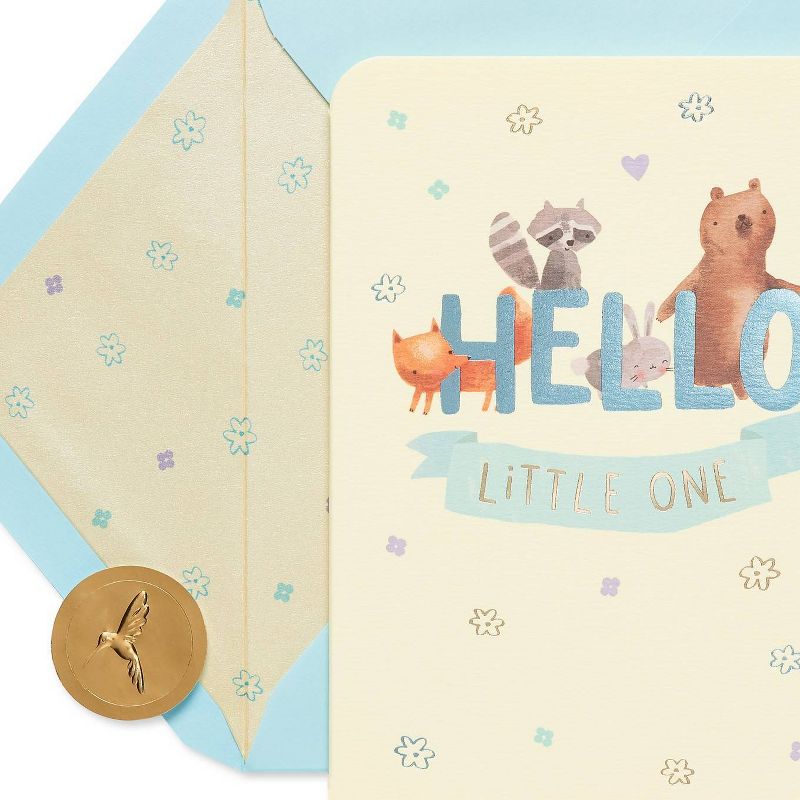 Welcome the arrival of a little one with cute baby cards from Papyrus! This sweet new baby card features a ‘Hello Little One’ greeting from a group of adorable animals painted in watercolors. Shimmering silver foil and quality, textured paper makes it more special. With unique artistry and exquisite materials, Papyrus greeting cards for a newborn baby offer premium and playful looks!