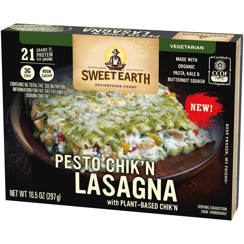 Sweet Earth Plant-Based Chik'n and Pesto Lasagna Frozen Meal offers ingredients that matter and taste that delivers in a delicious frozen dinner. This vegetarian lasagna is made with plant based protein chik'n, organic pasta, kale, and butternut squash. Enjoy the classic taste of this delicious frozen lasagna with plant protein. The savory lasagna is high in calcium and offers 21 grams of protein per serving. This Sweet Earth frozen lasagna is easy to prepare in the microwave in 6 minutes or in the oven in 45 minutes. Keep cook and serve microwave meal frozen until ready to enjoy.