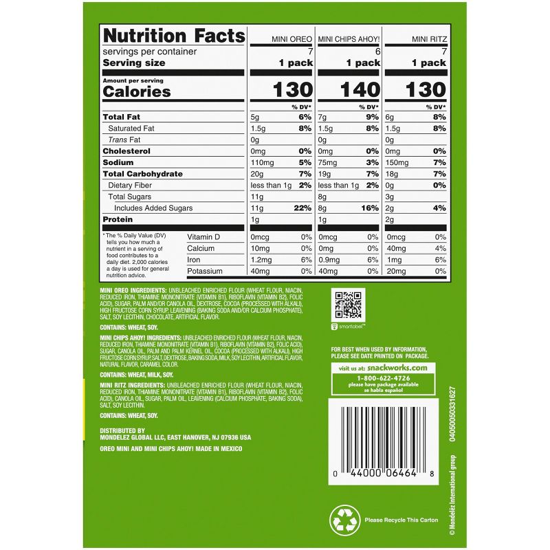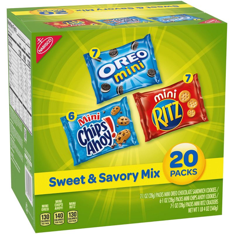 •This package contains 20 individually wrapped Nabisco snack packs, 7 OREO Mini Cookies, 6 Mini CHIPS AHOY! Chocolate Chip Cookies, and 7 Mini RITZ Crackers (packaging may vary)
