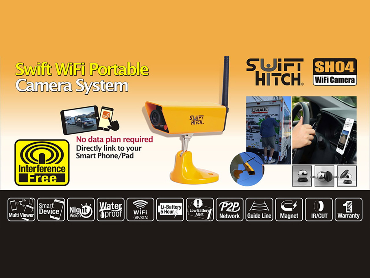 SH04 is Swift Hitch latest developed multi purpose camera. It can be viewed by iPhone DIRECTLY or via Router as an IP Security Camera to be seen anywhere. Its compact portable design can fit in many applications. It can be hitch-up camera, rear view camera, back up camera. It could be a very useful tool for RVer, trailer owner, truck/tow ower, combine tractor owner, fifth wheel trailer owner, mobilehome owner, boat trailer owner, farming machine owner, barn watching, warehouse & store watching, camping site watching, construction site watching, porch watching, home security, even babycare watching. You can even view multiple cameras in one phone or allow multiple person to share one camera. It could give you third eye when you back up, hitch up, driving and do regular security jobs.