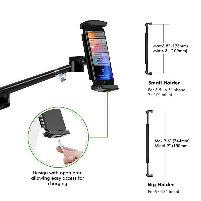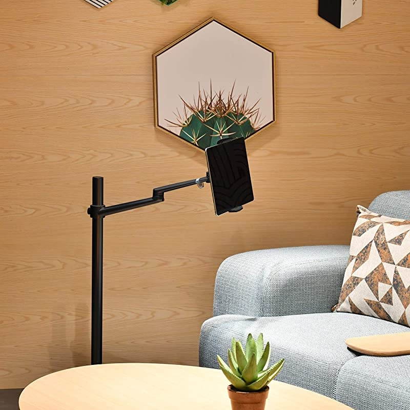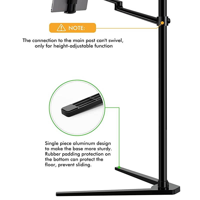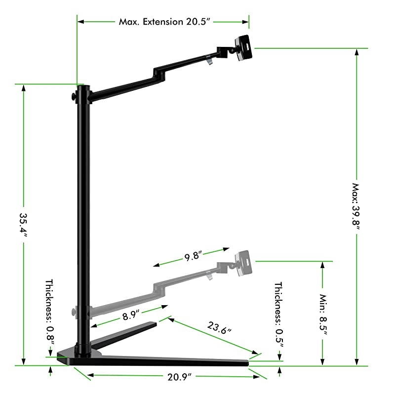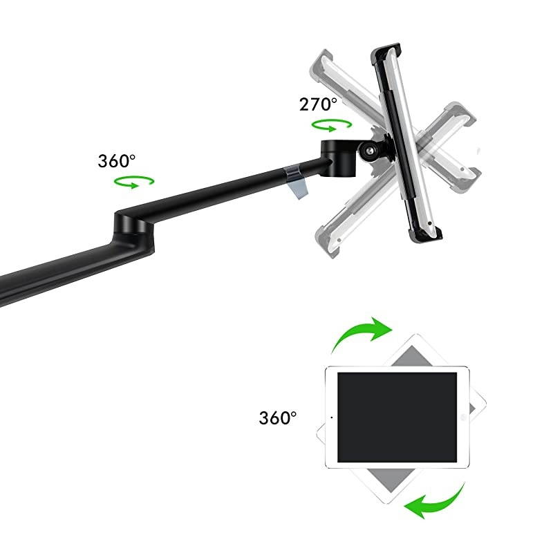 Flexible Angle: Height adjustable from 8.5 ''- 39.8 '' without pressure. Bracket arms and tablet holder rotate 360 degrees freely, stay any angle where you want that prevent neck and back fatigue. Arm max extension is below 20.5 ''*****Easy