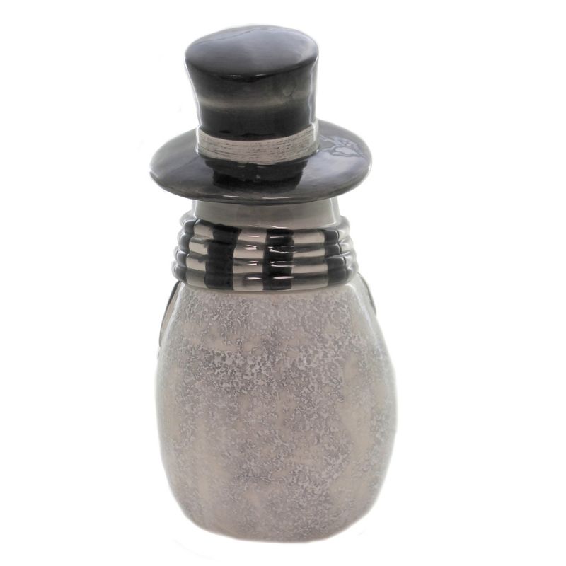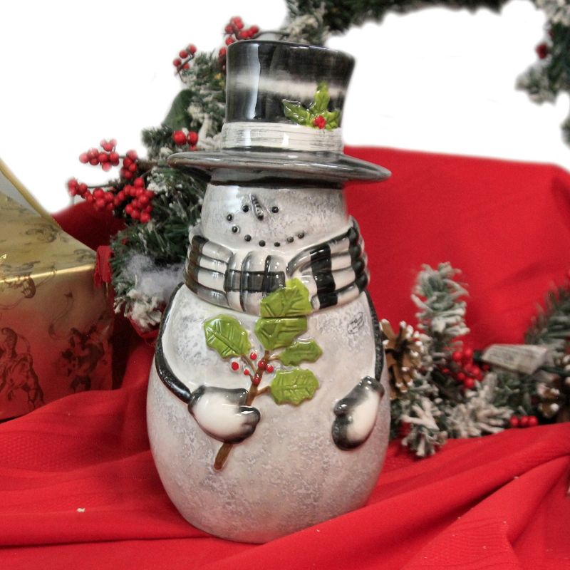 Gray Colored Snowman Cookie Jar With A Sprig Of Holly In His Hand And Wearing A Black Top Hat And A Plaid Scarf.. New. Comes Packaged In A Box.. Measurements 13.5 In H X 6.0 In W X 6.0 In D. . Made Of Ceramic. No Assembly Required. Indoor Use Only. Imported