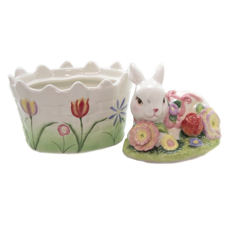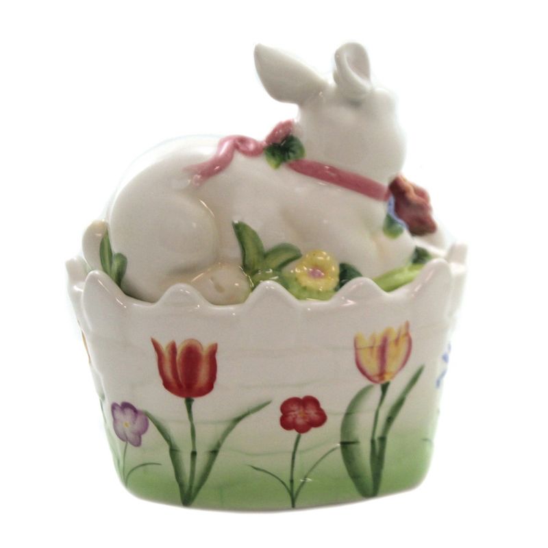 The Lid Is A Cute White Bunny Laying In The Green Grass Surrounded With Flowers Which Sit On Top Of A Woven White Basket Sitting In A Field Of Green. Spring Flowers Are Popping Up Everywhere Around The Basket.. New With Box. Measurements 6.5 In H X 6.0 In W X 5.0 In D. . Made Of Ceramic. No Assembly Required. Indoor Use Only. Imported