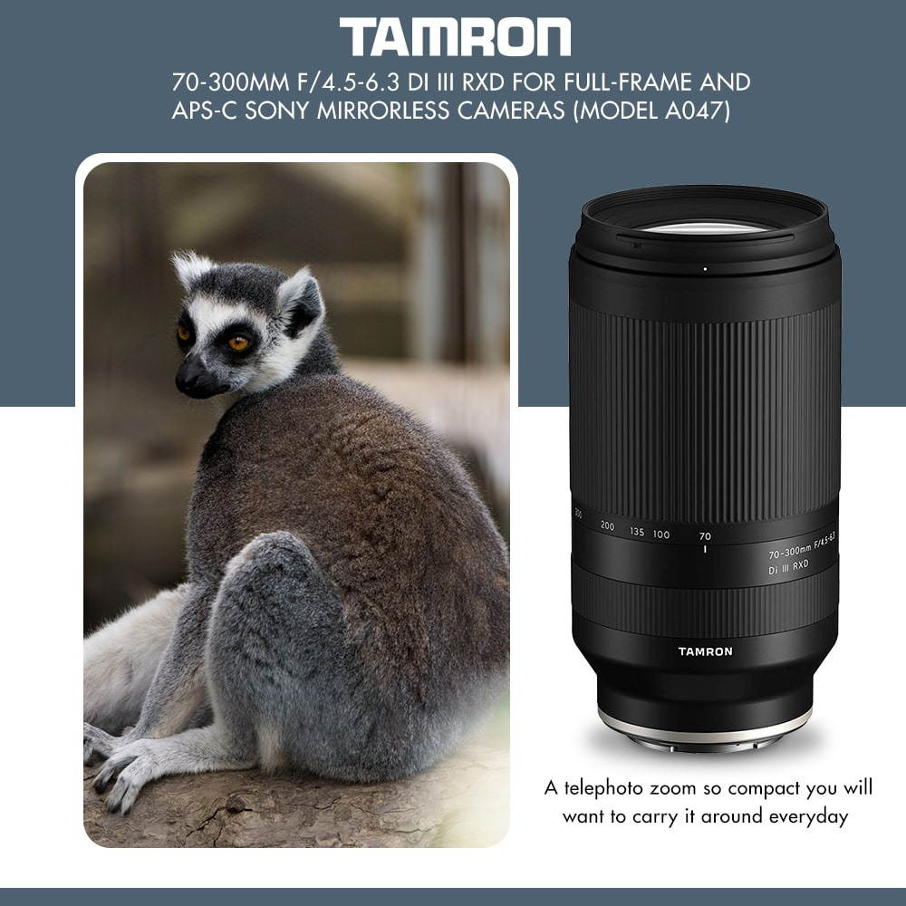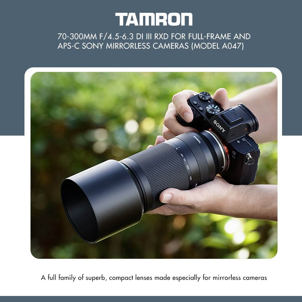 This is the 70-300mm F/ 4.5 - 6.3 Di III RXD (Model A047), to be used with Sony full-frame E-mount mirrorless cameras. Tamron says this telephoto zoom lens is the world's smallest size and lightest weight, at 148mm long and a max diameter of 77mm, and a weight of 545g. There are special elements added to the lens to fix chromatic aberration and others, while still achieving the hi-res image with bokeh qualities. The lens has a Rapid eXtra-silent stepping Drive motor unit, high-speed precision AF, and moisture-resistant construction. Ideally you'd use this lens for landscapes, sports, pets and wildlife.