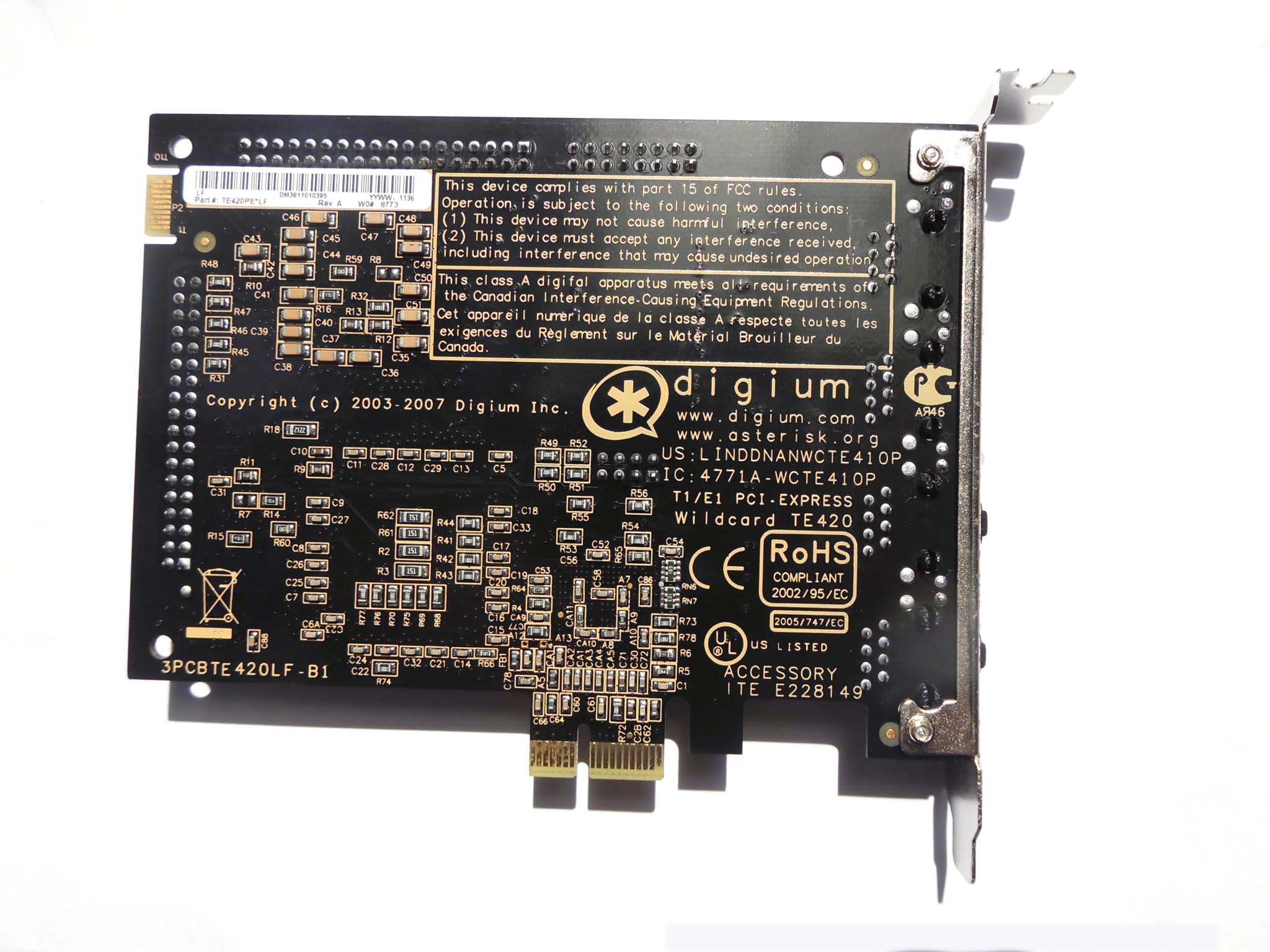 The TE220 PCI Express card provides termination of up to 60 channels of voice or data across two E1, T1, or J1 interfaces in a PCIe x1 form factor. Selectable on a per-port or per-card basis, the TE220 allows E1 and T1 circuits to be mixed with full channel synchronization. Supporting PCIe x1, the TE220 may be used in any available PCIe 1.0 compliant slot - 1x, x4, x8, and x16 without considerations for voltage selection or lane size.