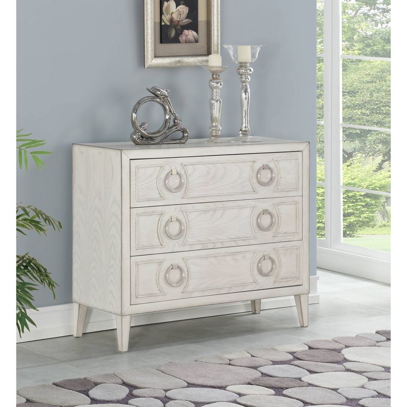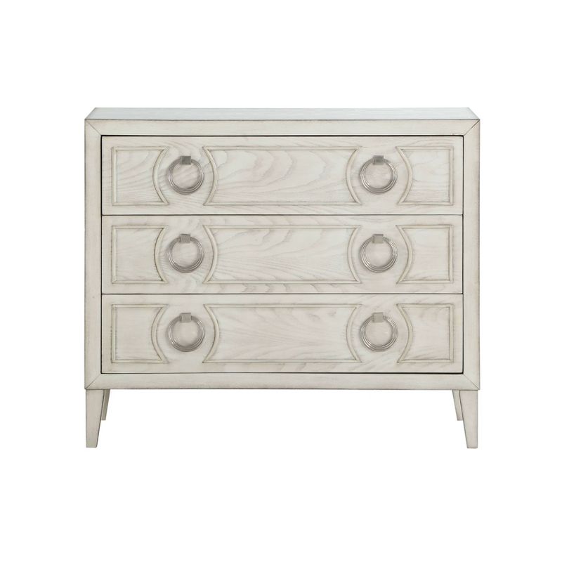 The Reeds White finish on this Chest will blend with any décor, and do so in style. With a classic squared frame, tapered legs and three deep drawers, all of which are adorned with oversized drop ring hardware and molded detailing, this beautiful chest provides not only that extra storage you need, but also gives you an ideal display area for your favorite photos, lamps, or a vase of fresh cut flowers.