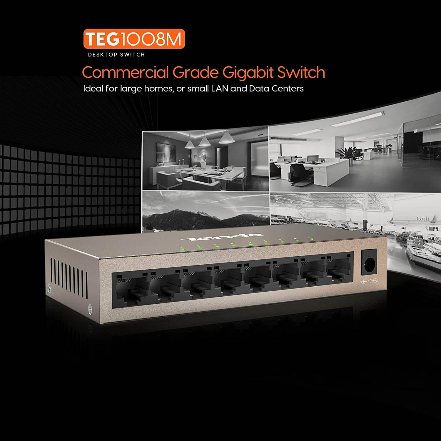 Tenda TEG1008M is a high-performance 8 Gigabit ports Ethernet Switch. It provides an easy, affordable and ideal solution for connecting to your router and modem router for additional wired connection (IP camera, laptop, gaming console, printer and etc). 1) It offers 8 10/100/1000 Mbps auto-negotiation ports and can increase the transmission rate by 10 times compared with a 100M switch, while ensuring the smooth transmission of large files and solves the problems of video jam and pictures loss in IP surveillance. 2) TEG1008M also can be a great space-saver thanks to its Mini size and has an excellent performance in heat dissipation because of its metal case, all of these are making it the perfect choice for your network.