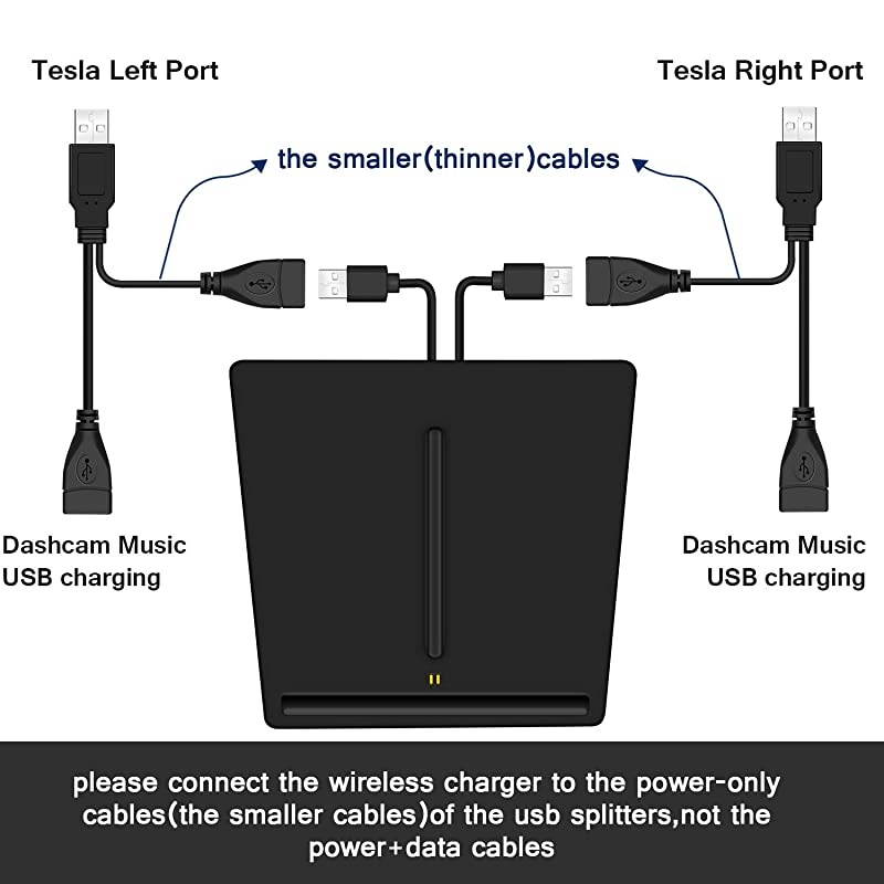 Note: Tesla 2019 8.2 / 8.3 / 8.4 software will causes all wireless chargers blinking or not working, please use USB splitter or USB hub to connect, that the problem would be resolved. *****EXCELLENT CHARG EXPERIENCESupport charge two phones simultaneously with the maximum output of 10 watt for each side. Tested with iPhone X, charge 1% power in 2~3 minutes with 5V 2A USB input. **