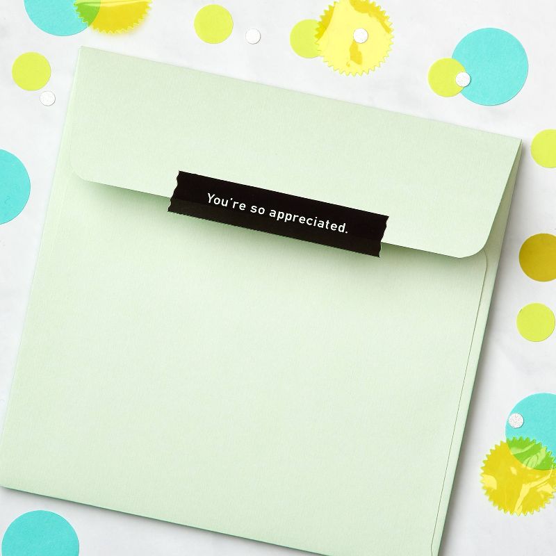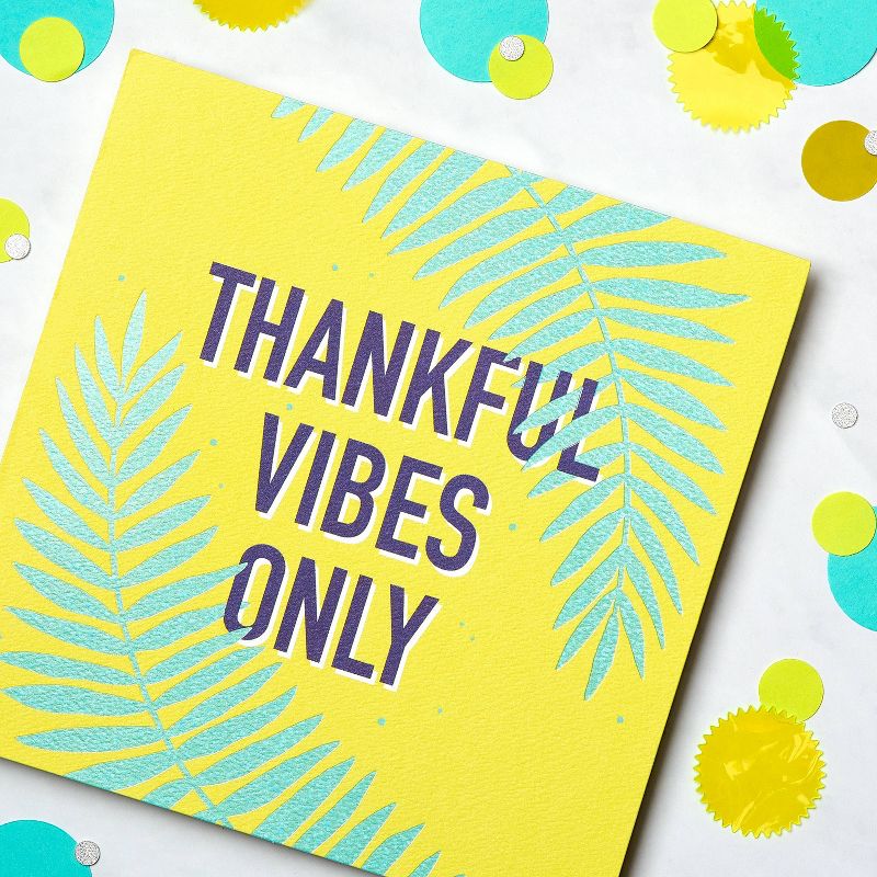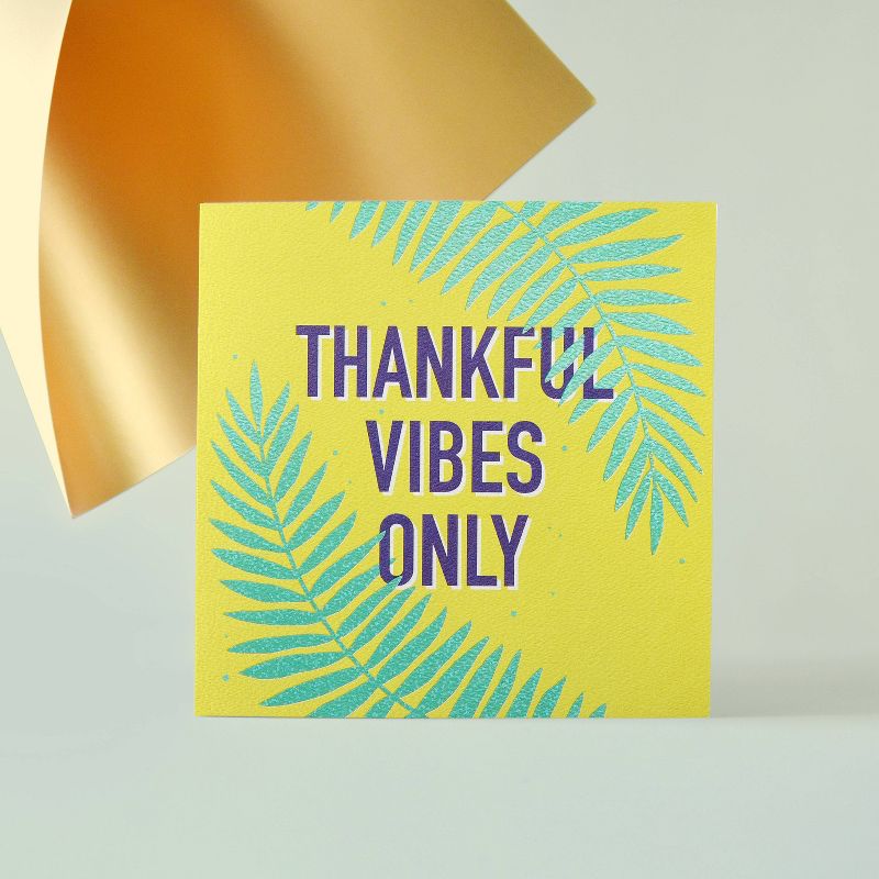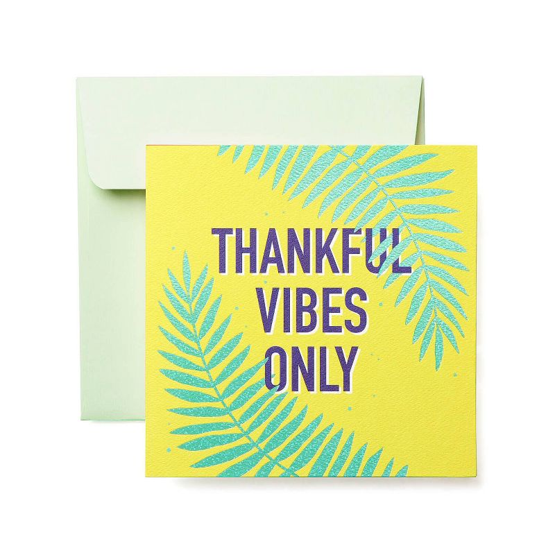 Thankful vibes only! This Present Company card by American Greetings makes it easy to fit gratitude into your busy life. Mirroring iridescent foil palm fronds frame the positive maxim that expresses exactly what you're feeling. Blank inside for your own personal message, this optimistic thank you greeting card is the perfect way to express appreciation for a gift, generosity or kind gesture. When you're ready to share, close the square card and envelope with a unique seal printed with a matching sentiment. With so many amazing people in your life, you'll always have a reason to connect. Present Company has cards that feel just right, every time!