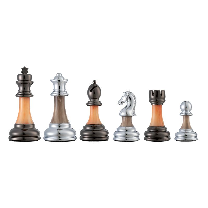 WE Games is proud to offer The Bobby FischerĀ® Series Metal and Acrylic chess set with beauty, style, and sturdiness. The metal tops and bottoms are made from a durable zinc alloy with a handsome black and and silver electroplated finish. The middle of the pieces are adorned with taupe and coral acrylic with swirls and veins that are reminiscent of fine marble. Each piece is heavy weighted and features felt bottoms to prevent scratching to your board. The king measures 3.5 inches in height with a 1.5 inch diameter base. Combine this set with a luxury board for a stunning chess set!