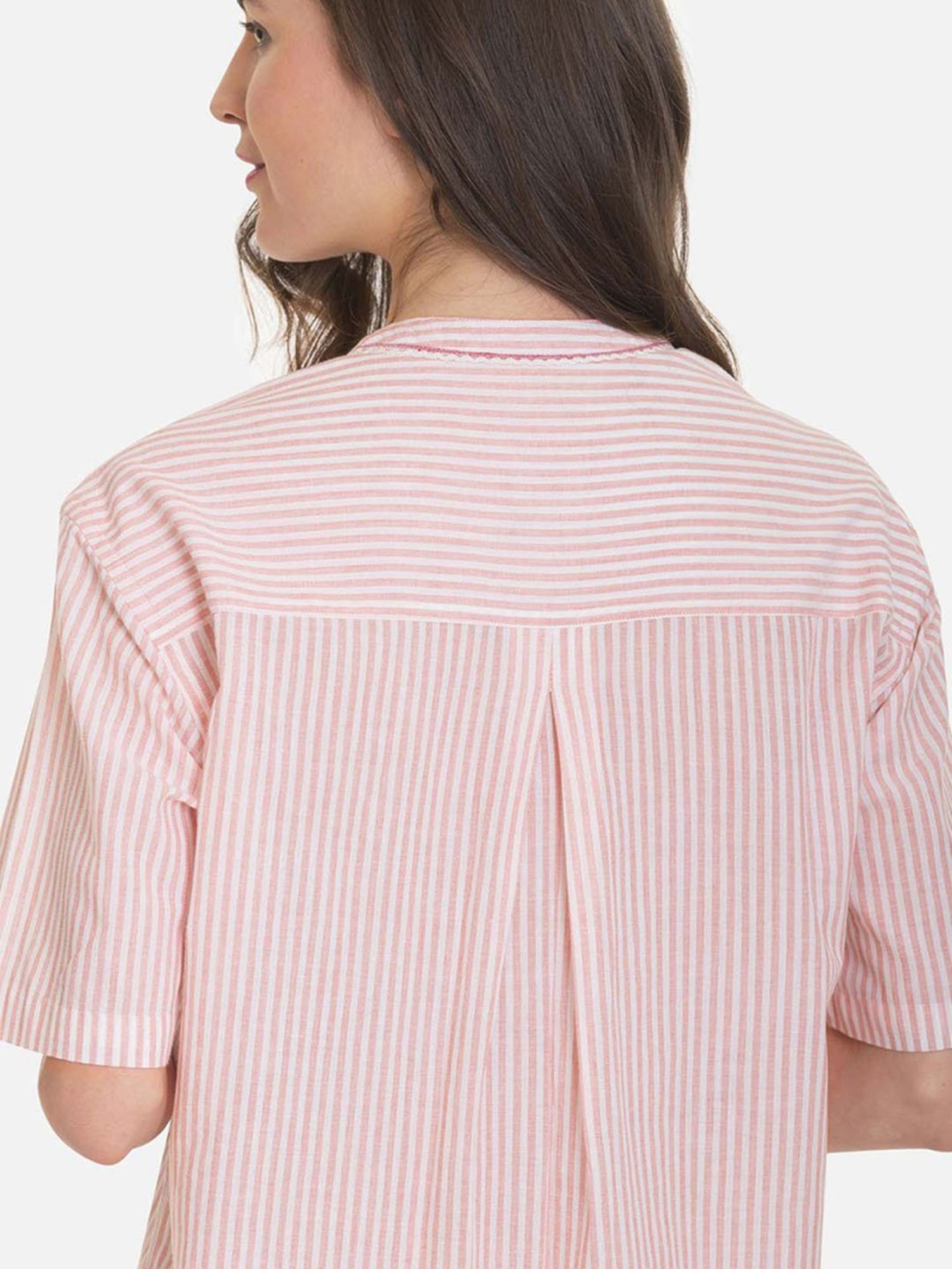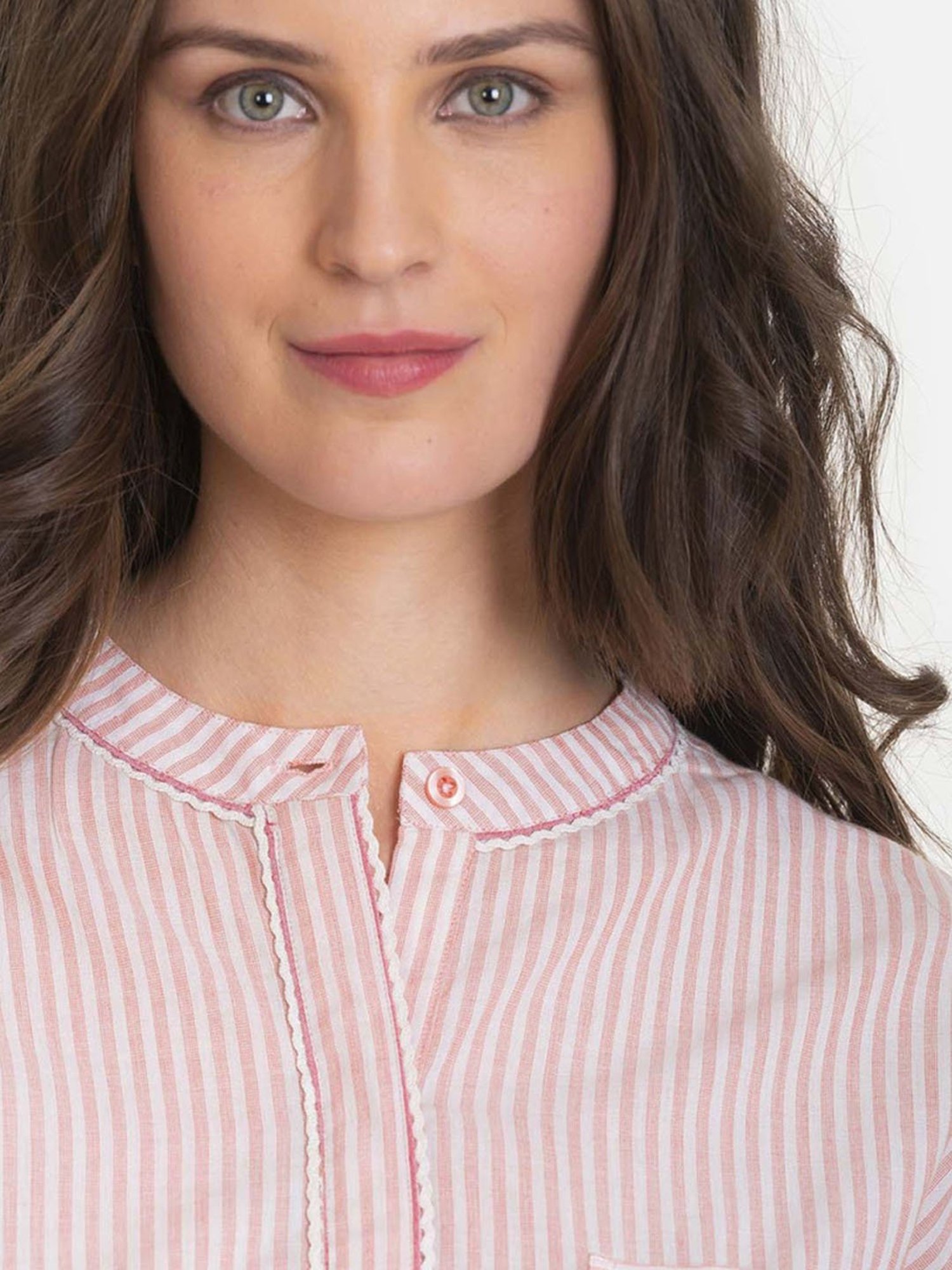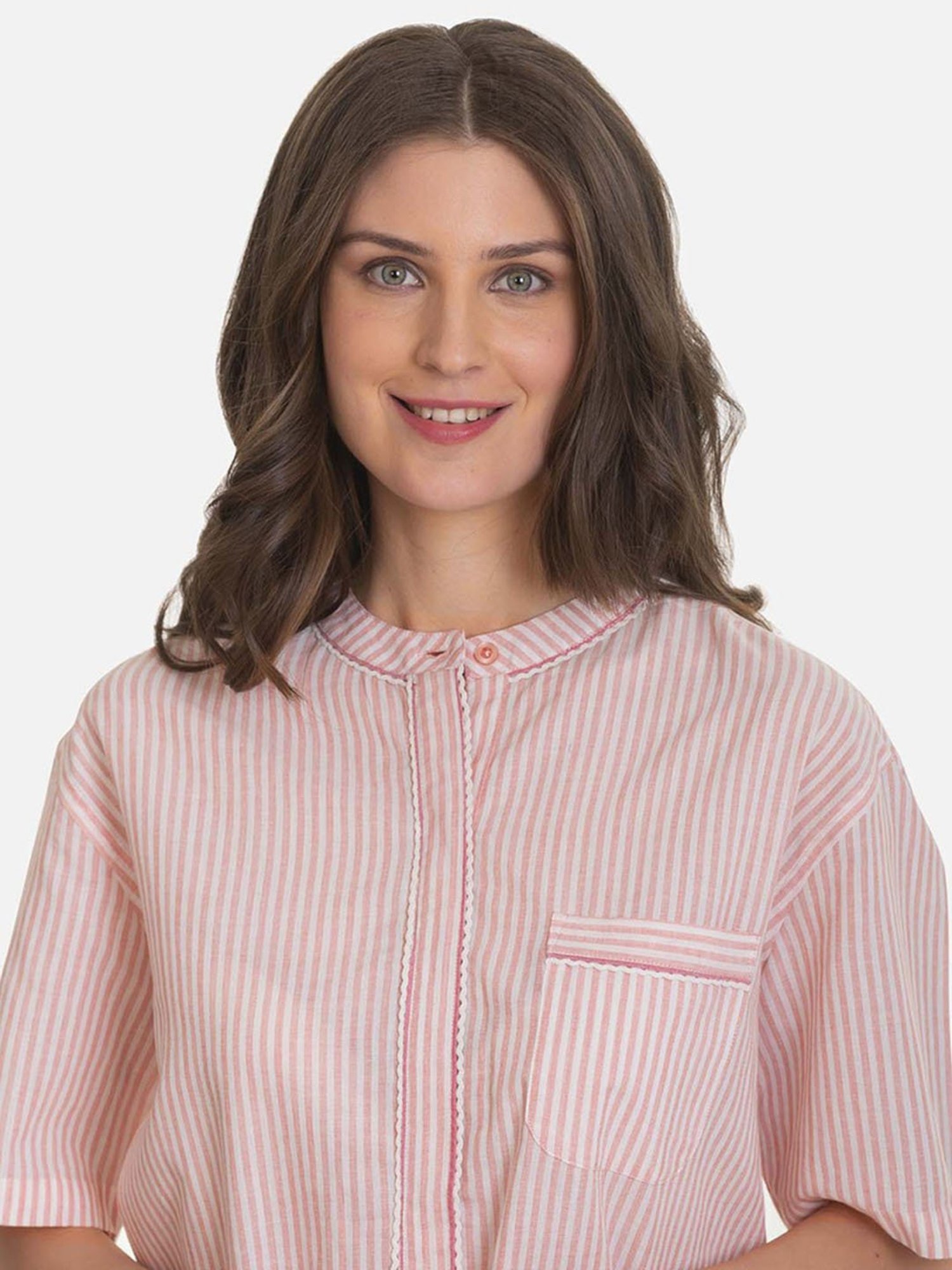 Deck up your wardrobe with this chateau rose night shirt from The Calm Collective. Tailored to sartorial perfection from premium quality super lightweight cotton, it assures a soft and soothing touch against the skin. The mandarin collar augments its design. The pixel striped pattern makes it a captivating choice. Disclaimer: Product colour may slightly vary due to photographic lighting sources. Country Of Origin - India.