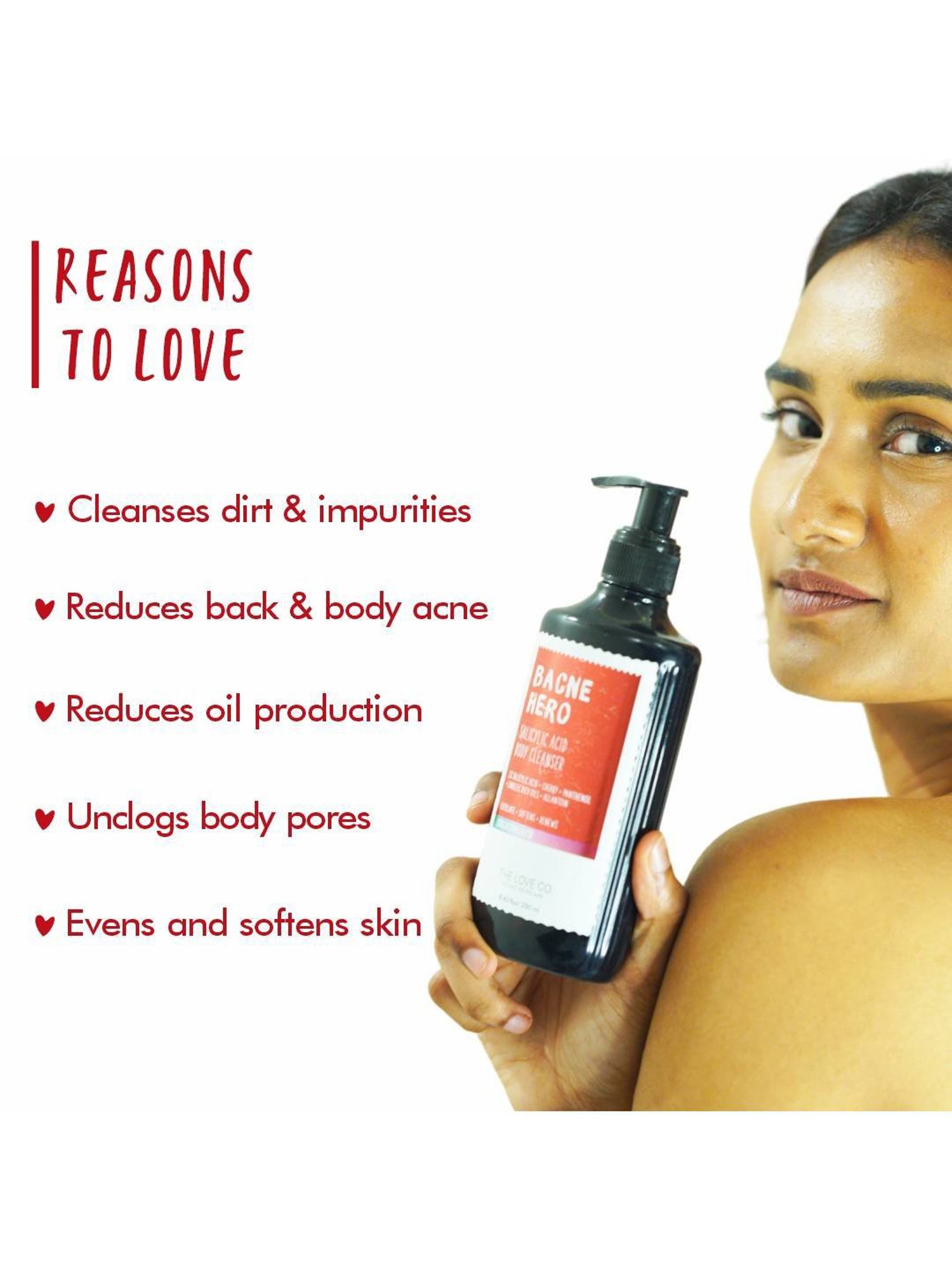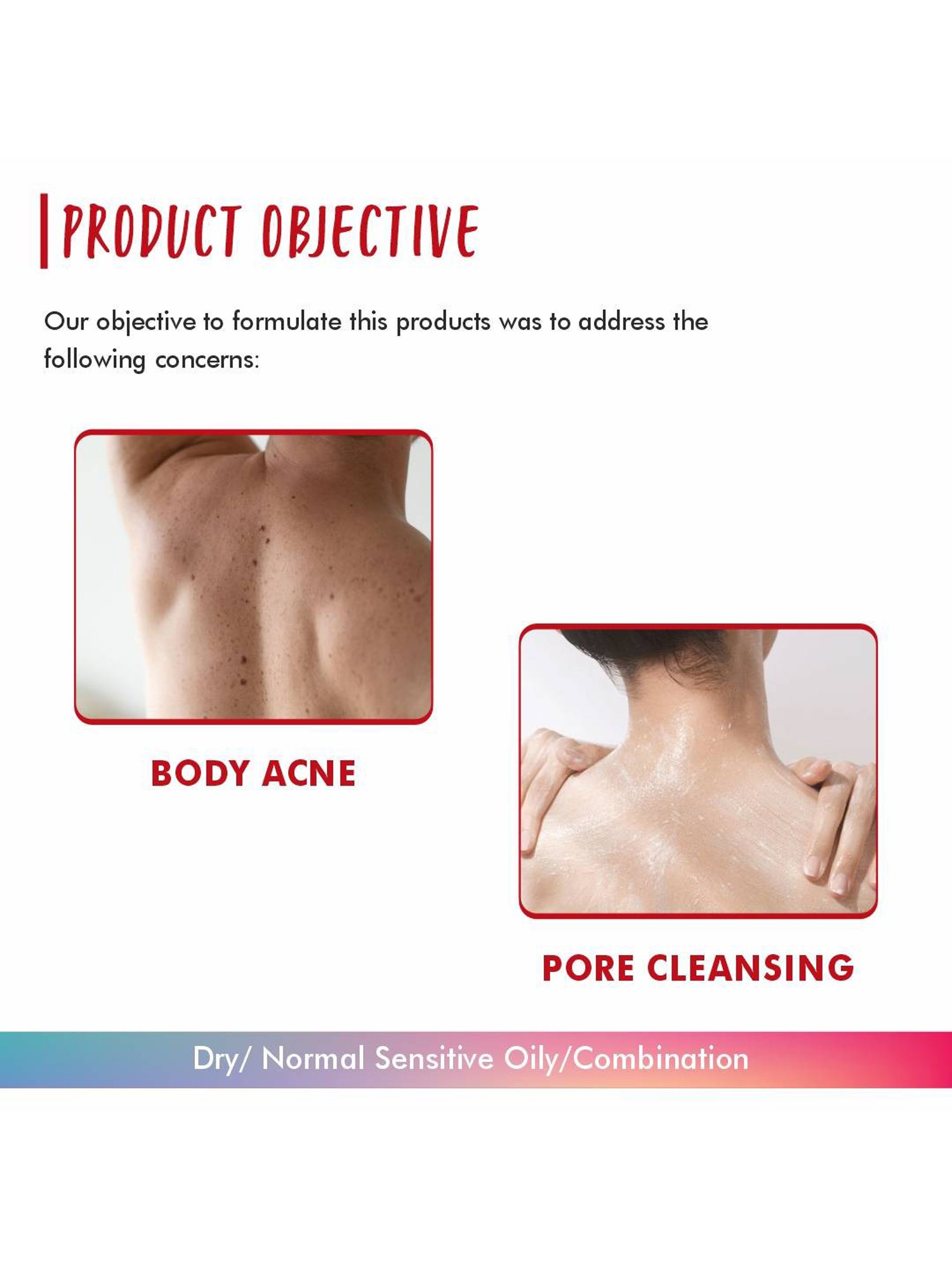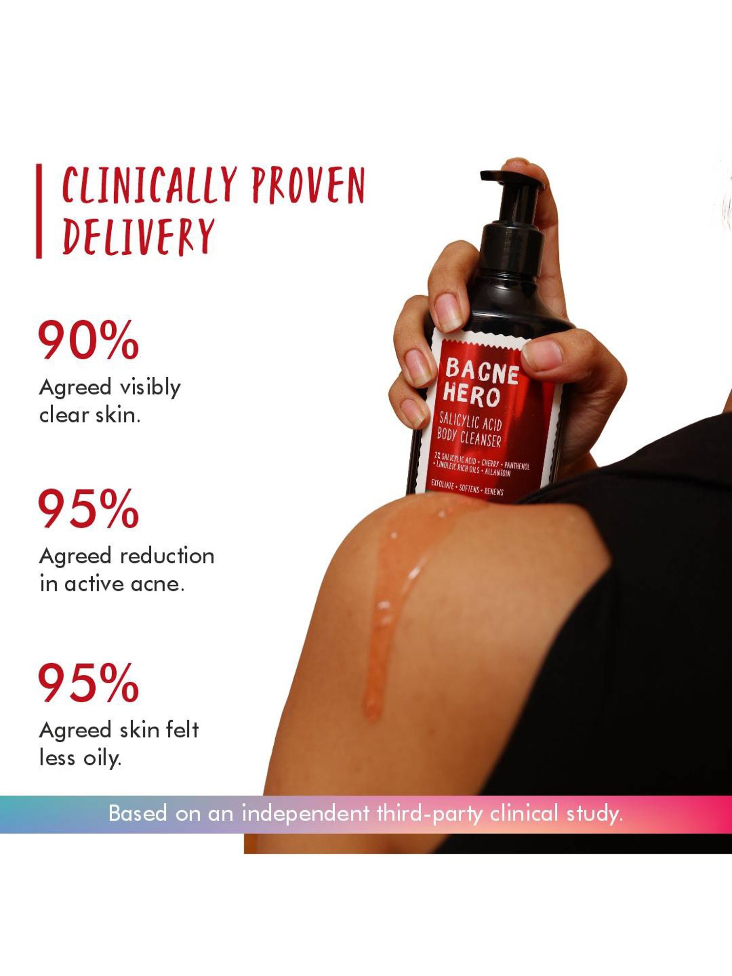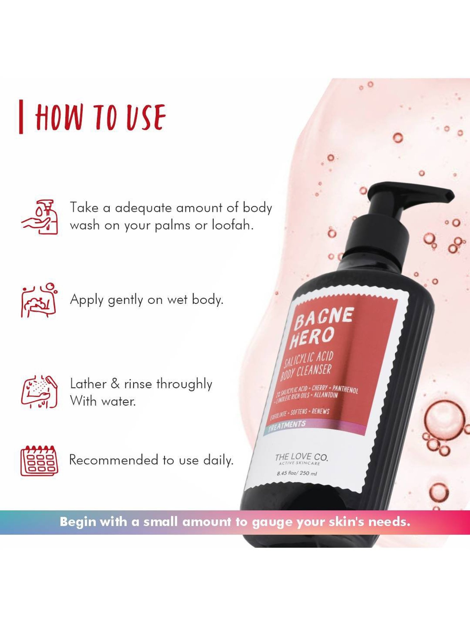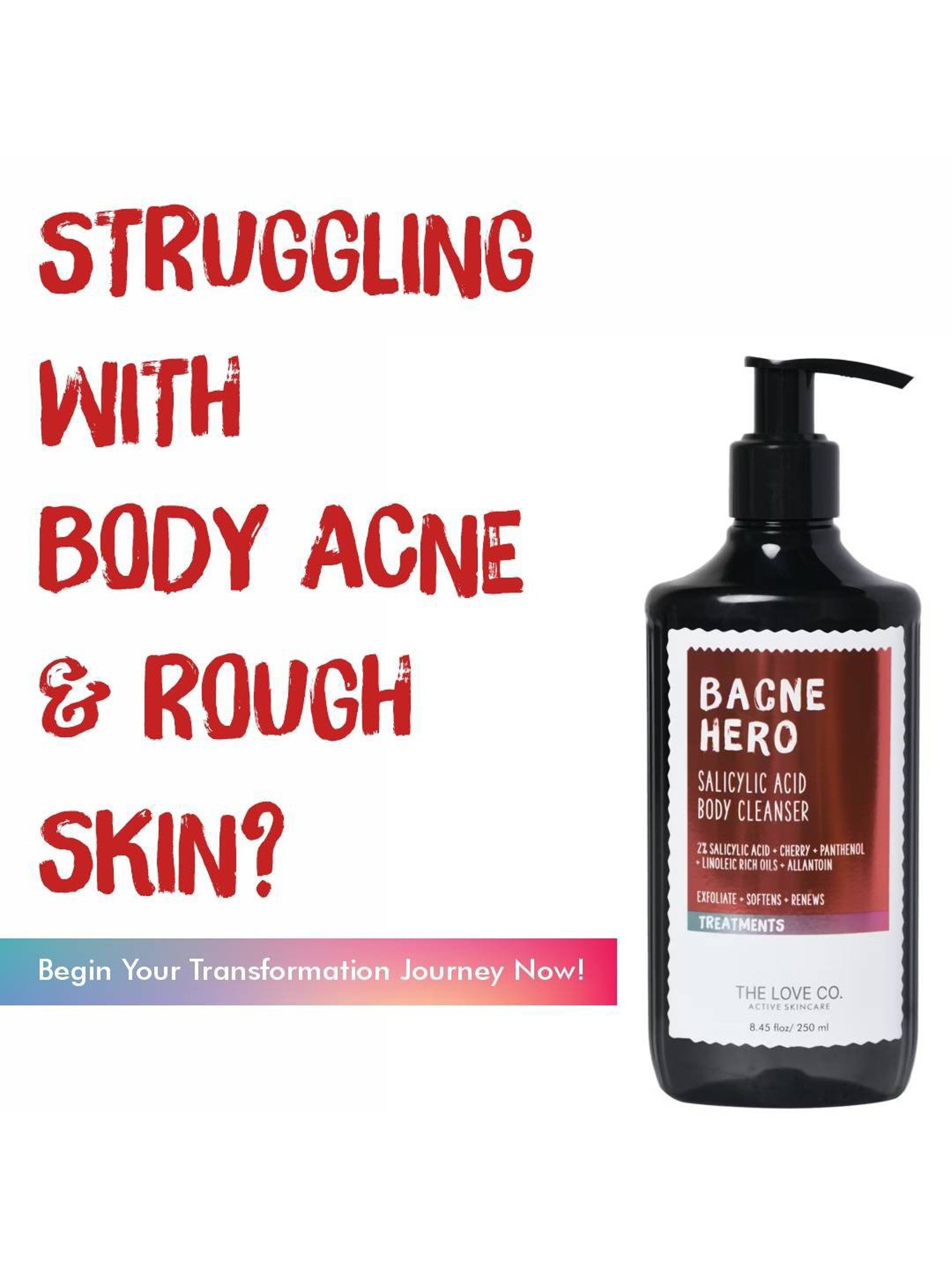 Bacne Hero Salicylic Acid Body Cleanser is a specially formulated body cleaner designed to target and treat bacne (back acne) while promoting smooth and healthy skin. This body wash contains 2 percent salicylic acid, a key ingredient known for its ability to exfoliate and unclog pores. With its gentle yet effective formula, this body wash helps to remove dead skin cells, excess oil and other impurities that can contribute to the formation of acne. By deeply cleansing the skin, it helps to prevent breakouts and reduce the appearance of rough and bumpy skin texture.