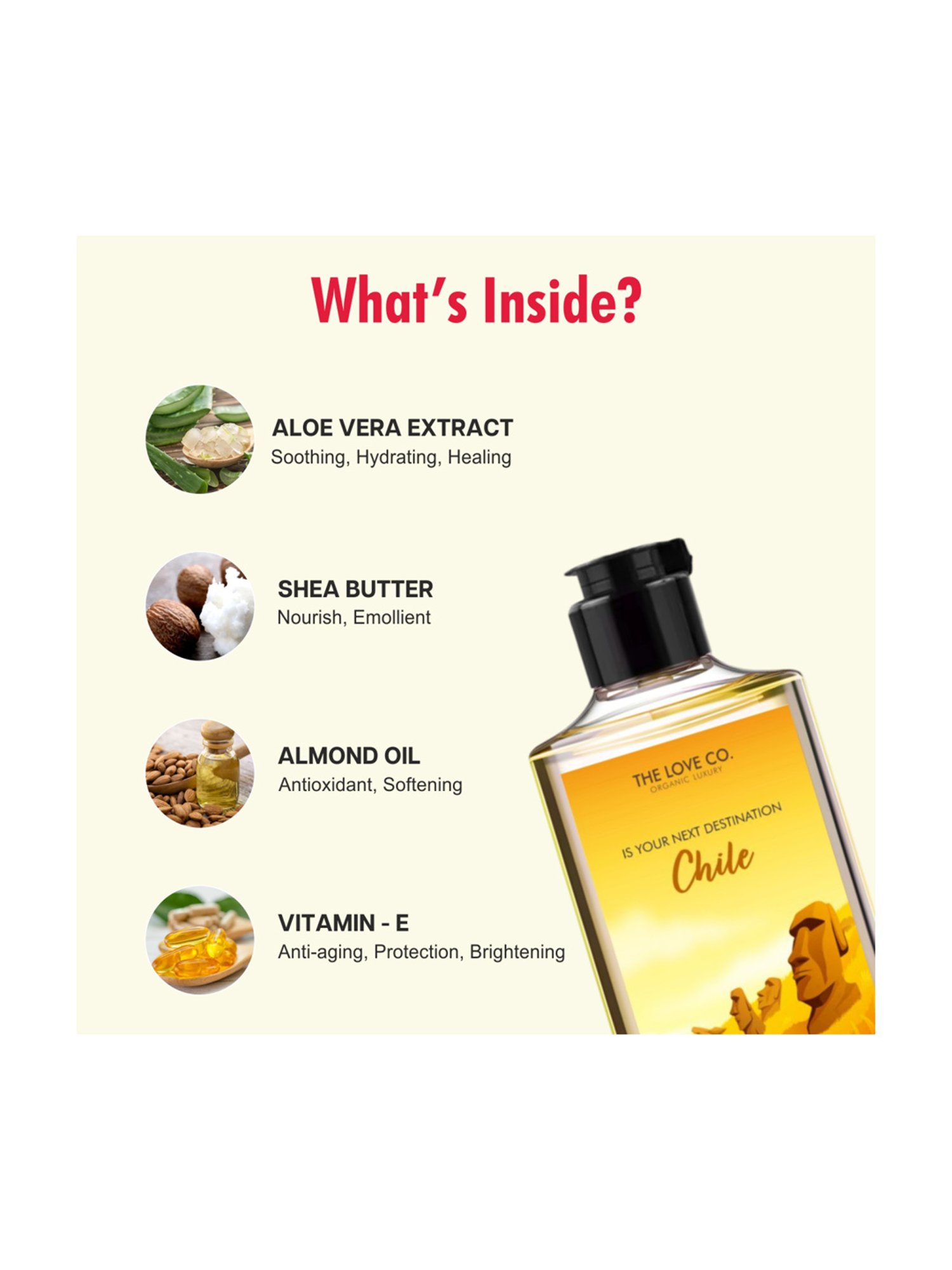 Chile Shower Gel embarks you on a sensory journey to the captivating landscapes of Chile. Our luxurious shower gel captures the essence of this vibrant country, blending invigorating fragrance with nourishing properties. Cleanse and hydrate your skin, leaving it refreshed and revitalized. Experience the indulgence of a rich lather as you transport yourself to breathtaking mountains, picturesque vineyards and pristine coastlines.