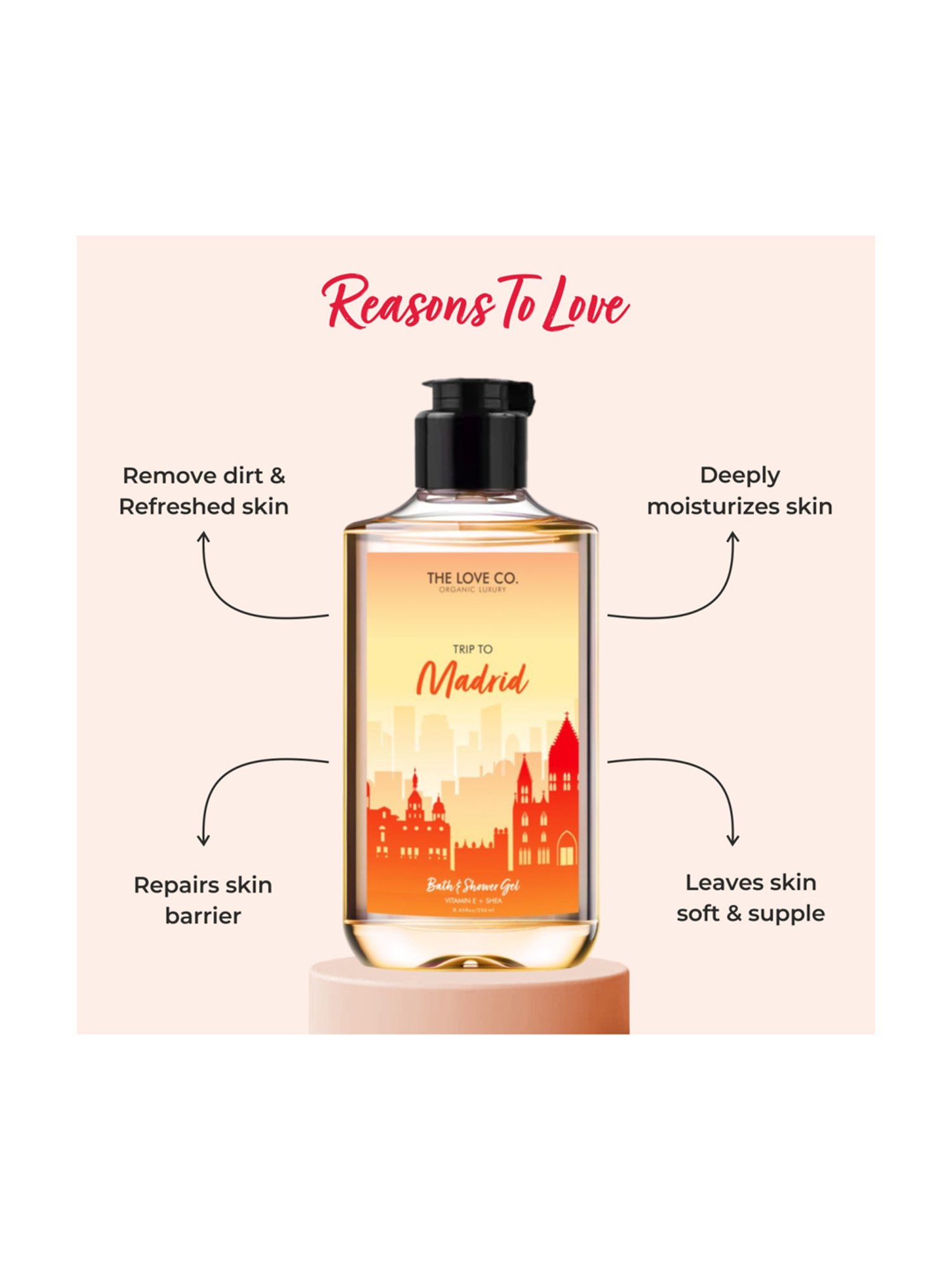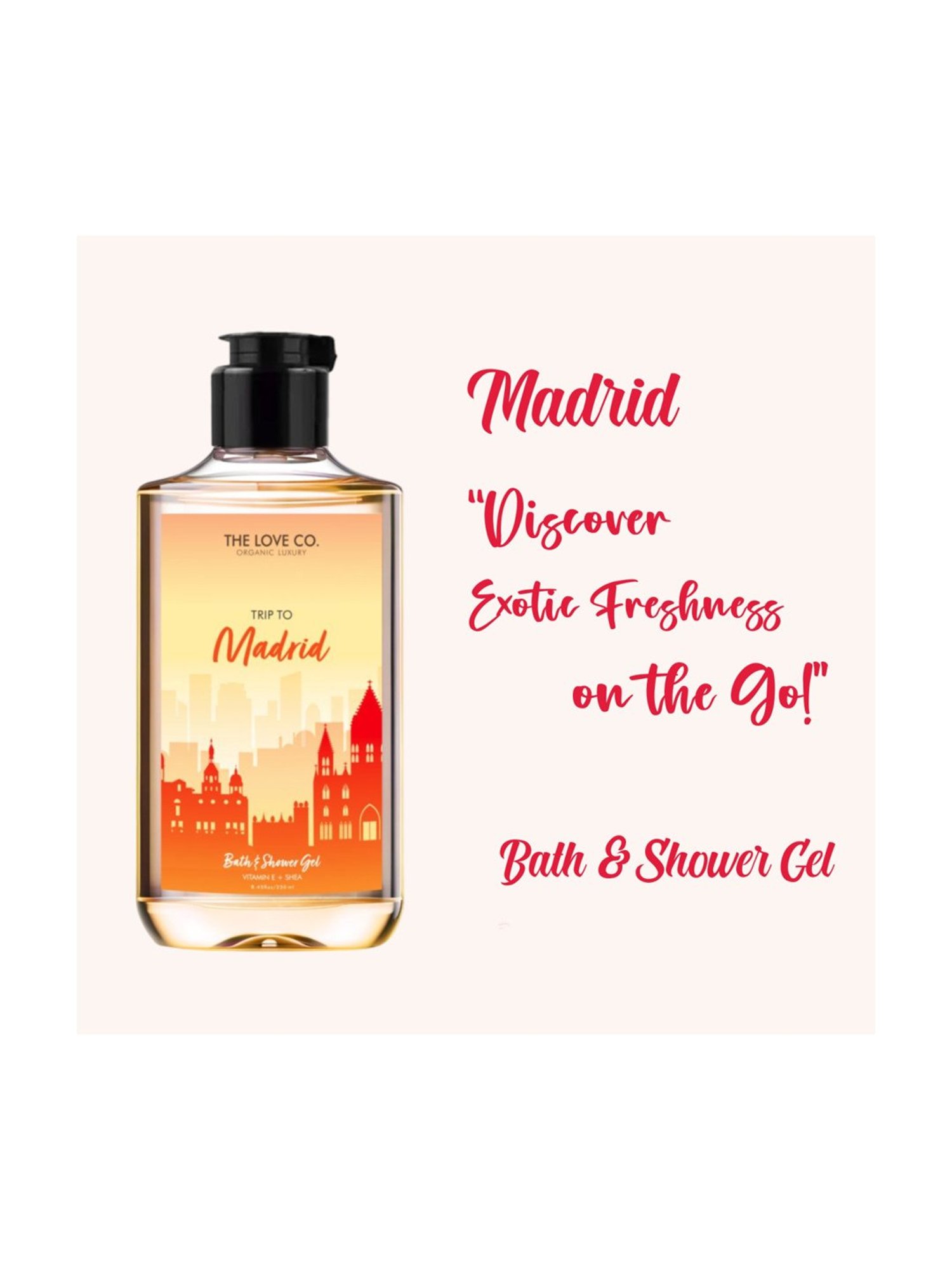 Madrid Shower Gel energize your senses with the vibrant essence of Madrid. Our luxurious shower gel combines invigorating fragrance with nourishing properties. Cleanse and hydrate your skin, leaving it refreshed and revitalized. Experience the indulgence of a rich lather as you immerse yourself in the energetic ambiance of Madrid. Elevate your bathing ritual and let the fragrance transport you to bustling streets and lively tapas bars.