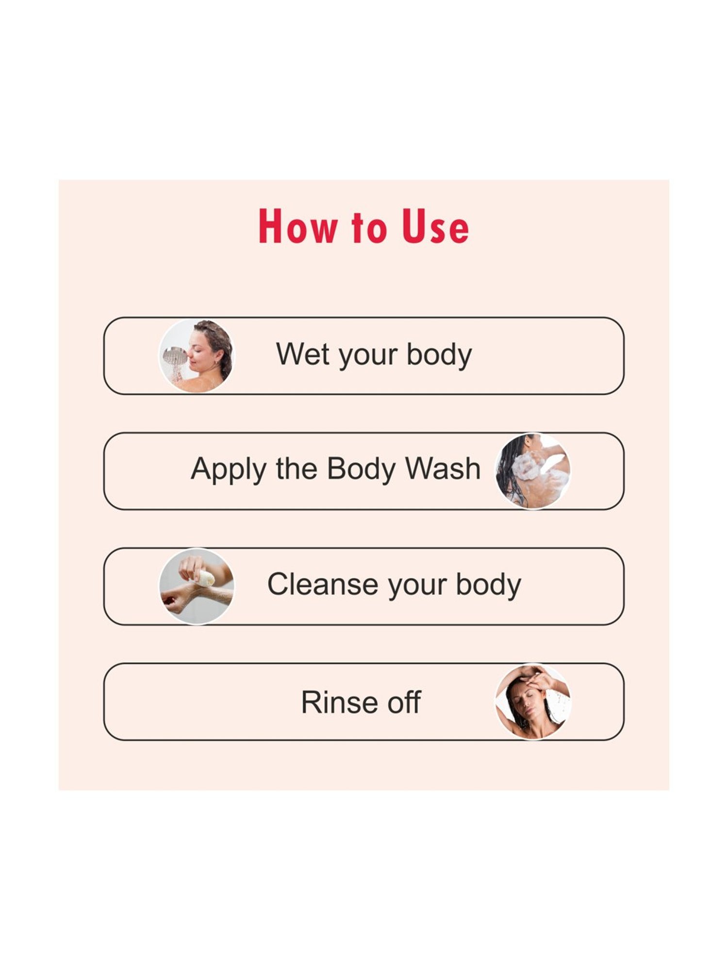 Step 1 - Wet your body with water and pour our body wash onto the wet loofah. Step 2 - Now massage gently to create rich lather,after cleansing rinse it off with water. |