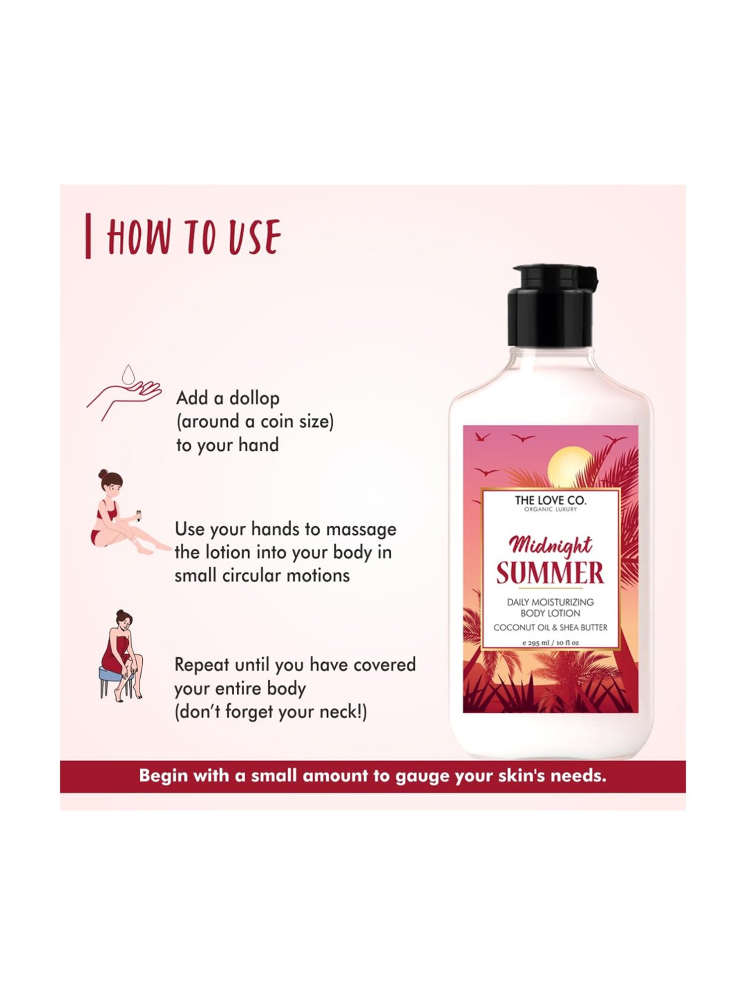The Love Co. midnight summer body lotion is a powerful, non greesy, non sticky, moisturizer which goes even with the driest skin, it absorbs quickly into the skin leaving it softer and smoother like never before. Being infused with the power of 15 natural butters it gives intense hydration which lasts upto 48 hours. Added vitamin E, B5 makes it a perfect body lotion for your daily skincare regime which nourishes deeply and make your skin youthful, glowy and radiant. Our body lotion is made with love without any harmful chemicals such as parabens, sulfates and ofcourse is cruelty-free.