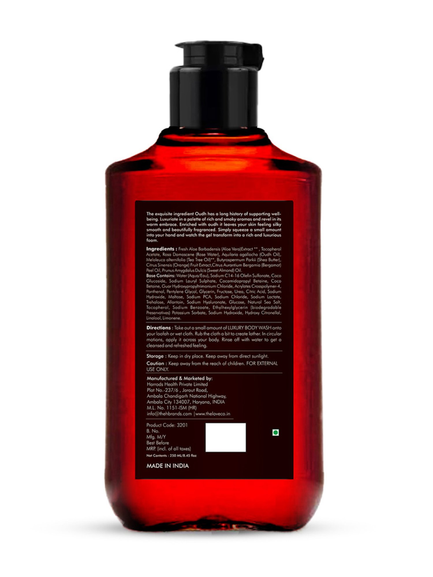 Composition: Fresh Aloe Barbadensis Extract, Tocopherol Acetate - Vitamin E, Rosa Damascene - Rose Water, Aquilaria Agallocha - Oudh Oil, Melaleuca Alternifolia - Tea Tree Oil, Butyrospermum Parkii - Shea Butter, Citrus Sinensis - orange Fruit Extract, Citrus Aurantium Bergamia - Bergamot, Peel Oil, Prunus Amygdalus Dulcis - Sweet Almond Oil, Coco Glucoside, Sodium Lauryl Sulphate, Cocamidopropyl Betaine, Guar Hydroxypropyltrimonium Chloride, Coco Betaine, Panthenol, Pentylene Glycol, Glycerin, Fructose, Urea, Citric Acid, Sodium Hydroxide, Maltose, Sodium Pca, Sodium Chloride, Sodium Lactate, Trehalose, Sodium Hyaluronate, Glucose, Natural Sea Salt, Tocopherol, Sodium Benzoate, Ethylhexylglycerin.