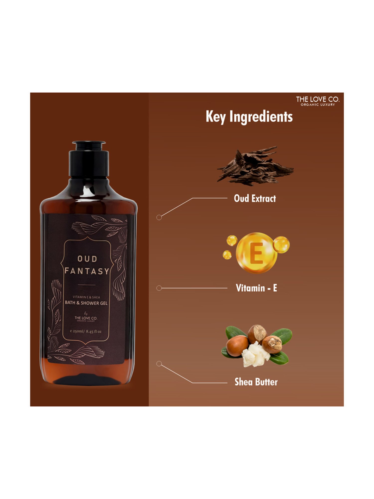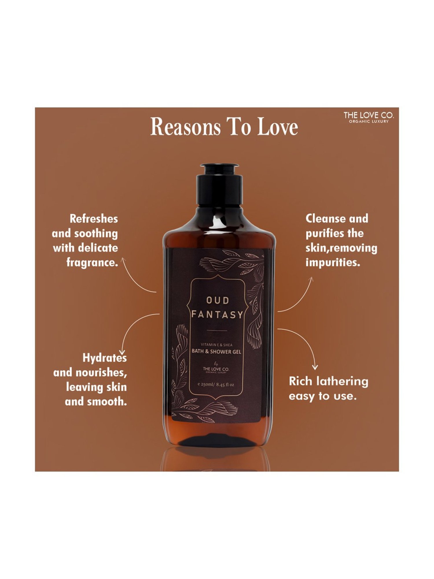The Love Co. oud fantasy bath and shower gel comes with an irresistable fragrance which won't let your bath care dreams stop here, along with the attractive, luxurious formulation it effectively kills all the germs, dirt, excess oil, odour, sweat, and makeup from your skin. It helps your skin retain its natural moisture, leaving your skin softer, smoother, plump and fresh all day. A very effective yet gentle which goes with all skin types, the bath and shower gel is completely safe and free from all toxins, parabens, phosphates, glutens and other harsh chemicals, instead is 100 percent vegan.