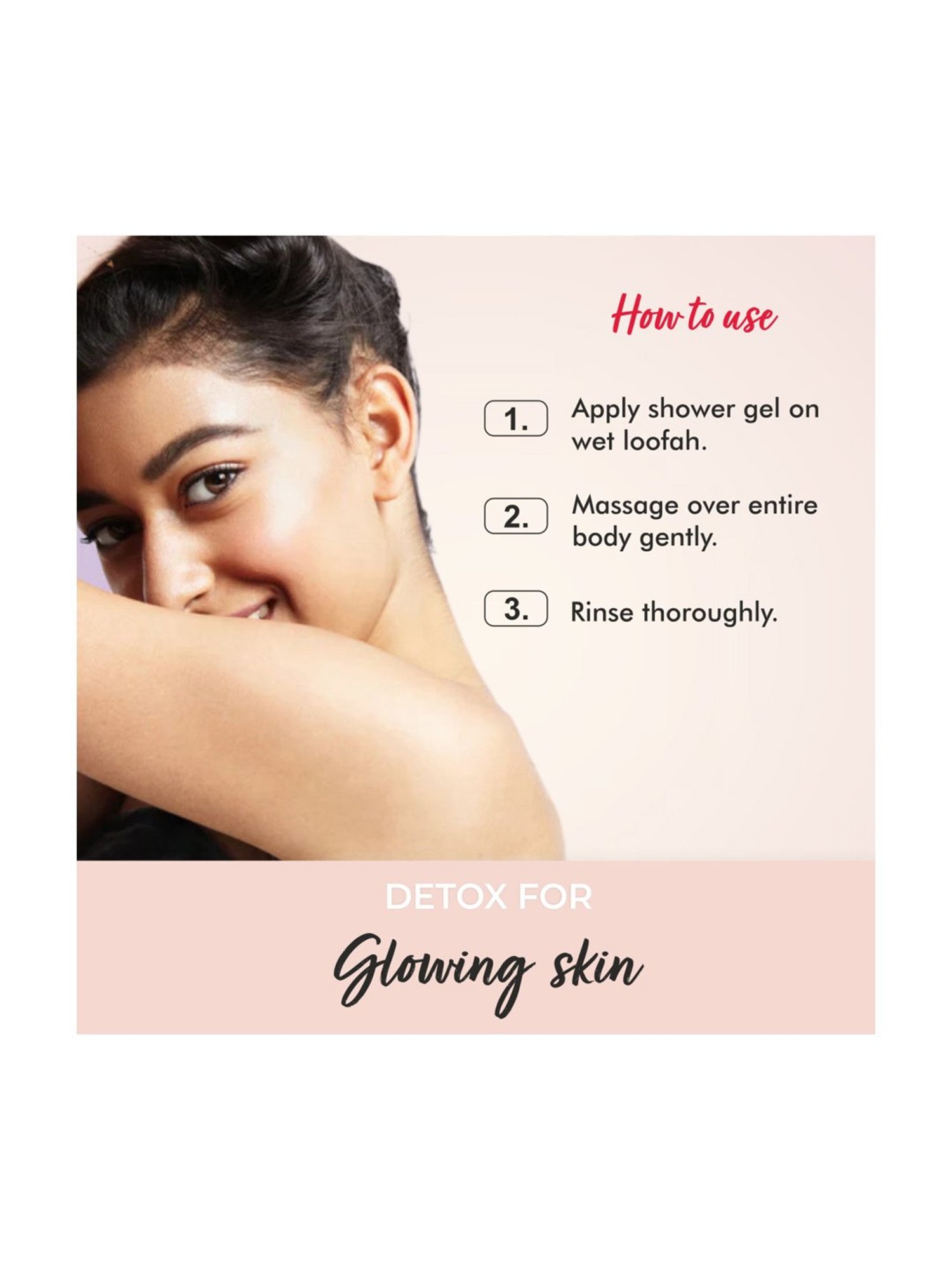 Step 1 - Wet your body with water and pour the body wash onto the wet loofah. Step 2 - Now massage gently to create rich lather. Step 3 - After cleansing rinse it off with water for fresher,smoother and hydrated skin. |