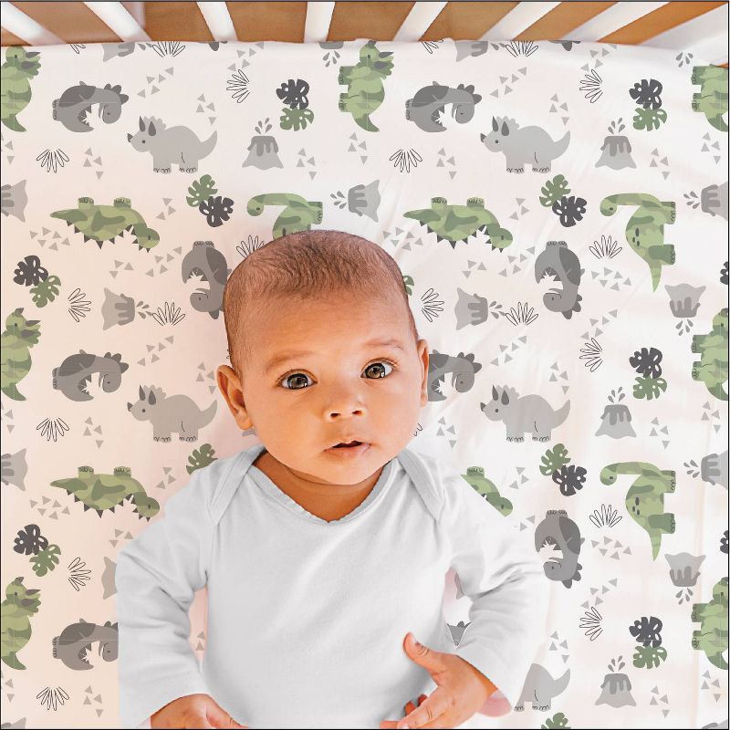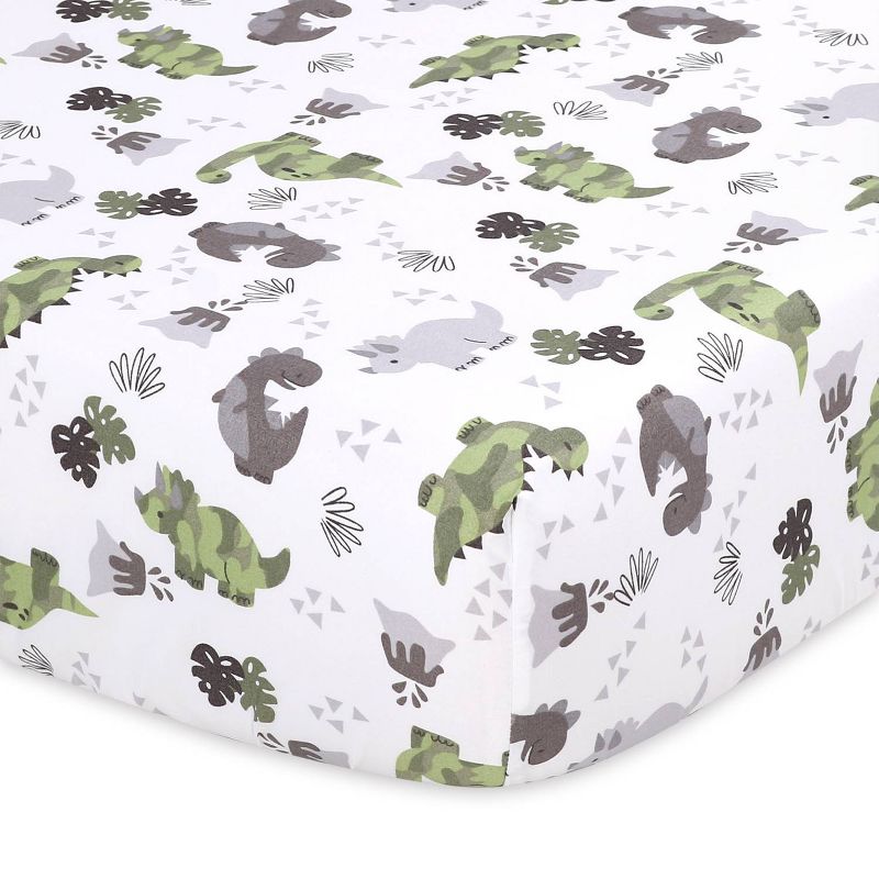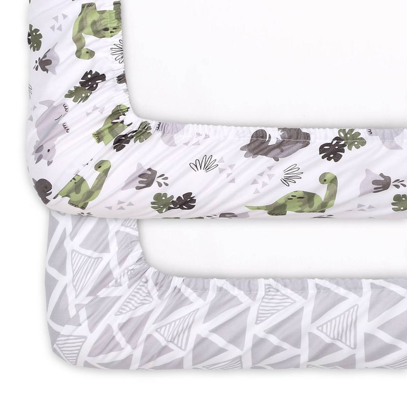 Your little one will be absolutely transported when they go off to sleep with their new best prehistoric pals in these Dino 2 Pk Microfiber Sheet set from The Peanutshell. The one sheet features delightful dinos in shades of green and gray on a crisp white ground, while a bold geometric of gray triangles on a crisp white ground are featured on the other. Microfiber fabric is touchably soft and the easiest of care; pack of two allows for quick changes. Perfect for any baby's room - a boy, a girl, or both!