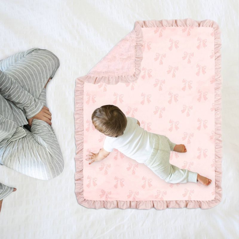 Dusty pink is a rich, romantic color that gives any nursery a chic, sophisticated style. This Peanutshell blanket is touchably soft with novelty fur and a ruffled border of moire taffeta. The reverse side of the blanket features a printed matte satin. The luxe sheen of the satin catches the light for a soft glow. Whether you use as a photo backdrop, nursery accent or for cuddle time, this blanket is as versatile as it is stylish.