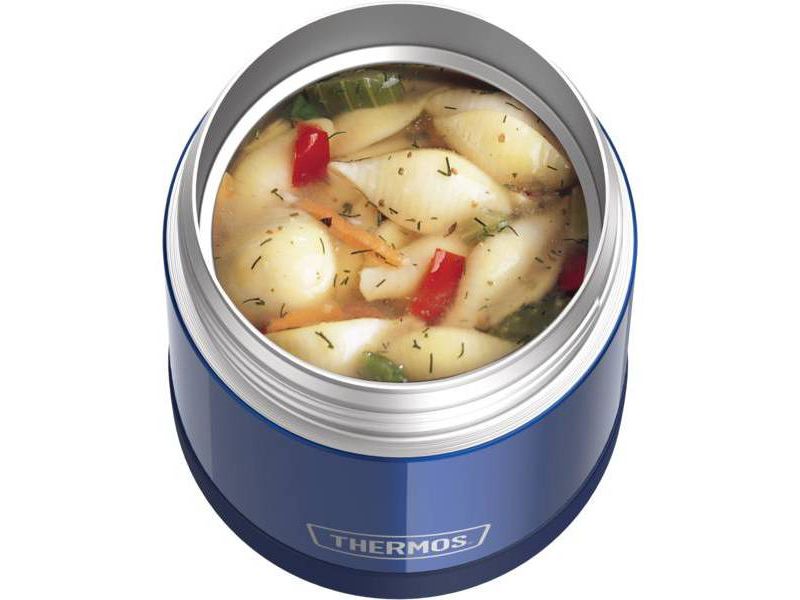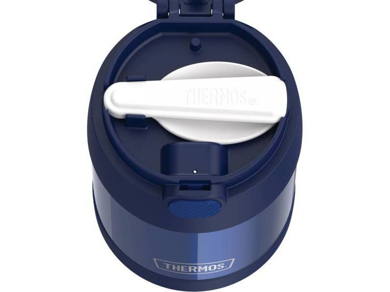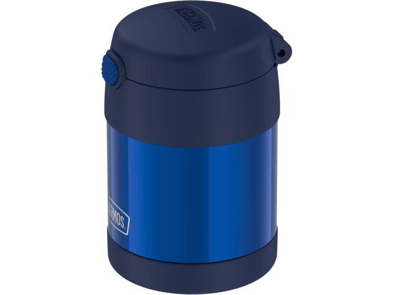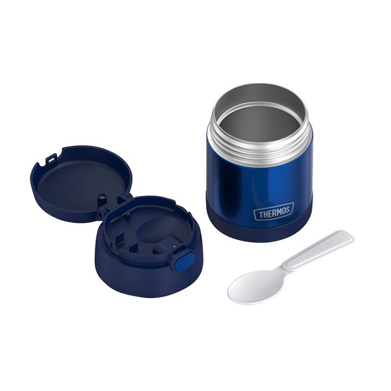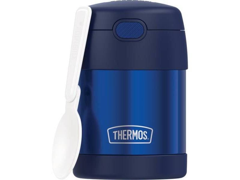 The 10oz FUNtainer® Food Jar from Thermos® brand is vacuum insulated to keep hot foods hot and cold foods cold-and since it's designed for kids it's also colorful and fun. Send them to school with Mom's homemade soup so they can enjoy it fresh and hot at lunch time. If they're in the mood for a cold snack, pack it up with yogurt and berries, or apples and peanut butter. The FUNtainer food jar is light weight and compact with a push button lid so it’s easy to carry and open. Kids work hard and once lunchtime hits they need the healthy stuff to power them through the rest of the day. This handy kids food container has a wide mouth, which lets them gobble and gulp their food right out of the bright-colored jar. To clean, you can pop your FUNtainer food jar in the dishwasher; however washing by hand is recommended. Spoon included.