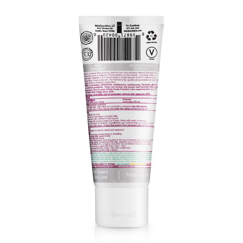 Supremely moisturizing for soft, smooth skin, Thinksport Safe EveryDay Face Sunscreen Lotion with SPF 30 dries quickly and provides an excellent base layer for makeup application. Lightly tinted to reduce any whitening effects of minerals, Thinksport Everyday Face still provides SPF 30+ protection from the harmful effects of sun exposure, and the light tint blends seamlessly into all skin tones. Formulated with Non-Nano Zinc Oxide, EWG Verified and free of biologically harmful chemicals like avobenzone, oxybenzone, parabens, phthalates, PABA, and 1,4 dioxane. Water resistant up to 80 minutes, cruelty free and reef safe.