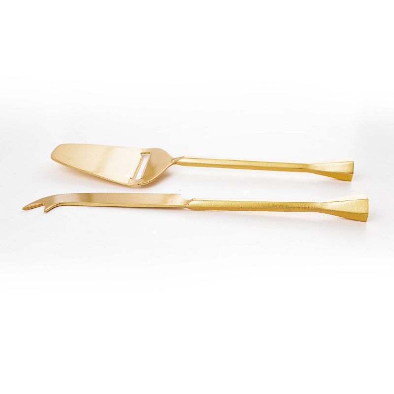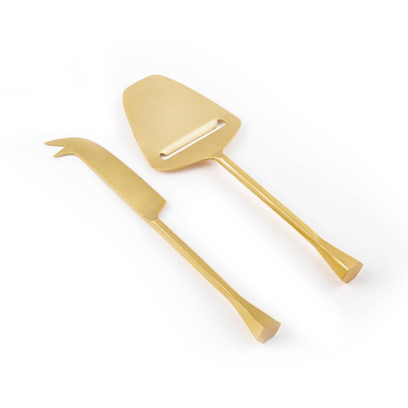 Thirstystone's Cheese Slicer Set 2pc is a sophisticated way to serve cheese at your next party. The set is made of sturdy and durable steel with a food-safe matte gold tone finish. Each piece in the set is designed to cut or spread cheeses of varying hardness, for maximum versatility. This set is perfect for special occasions and comes packaged in a striking black and white striped box with a gold bow.
