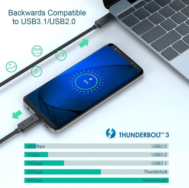 PD charging protocols 4: Thunderbolt 3 uses the "USB Type-C" connector built into late 2016 MacBook Pro and newer models, but is physically not suitable for Thunderbolt 1 or Thunderbolt 2 ports on previous generation Mac systems Compatible with MacBook Pro 2016/2017/2018/2019 iMac, MacBook Air 2018, iMac late 2017 Microsoft Surface Book, Google Chromebook Pixel; Dell XPS, mDell Precision 5510, mDell Inspiration 15 7000, HP Spectre, Chromebook 13 G1; Samsung Galaxy S8 + Tab Pro, Acer Switch Alpha 12, Acer Spin; Thunderbolt 3 dock, storage and peripherals. durable Coaxial ultra-high-speed line, improve and stabilize data transmission speed Bend-resistant insulation and environmentally friendly halogen-free TPE cable jackets are wear-resistant materials that can provide you with long-term service