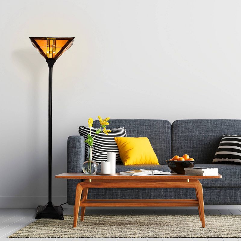 This Tiffany Style Torchiere LED Floor Lamp from Hastings Home adds warm ambient light in a living room, bedroom, office, or in an entryway. Designed with a stable dark brown metal base, a convenient on/off switch at the top of the metal pole supporting a 92-piece handcrafted stained glass inverted pyramid shaped shade with 16 cabochon accents, this vintage inspired lamp will complement almost any style of decor. The lamp comes with an energy-efficient 9W 805 lumens LED bulb that will glow for up to 25,000 hours each before needing to be replaced.