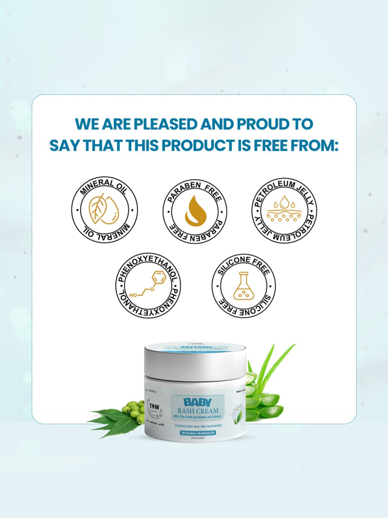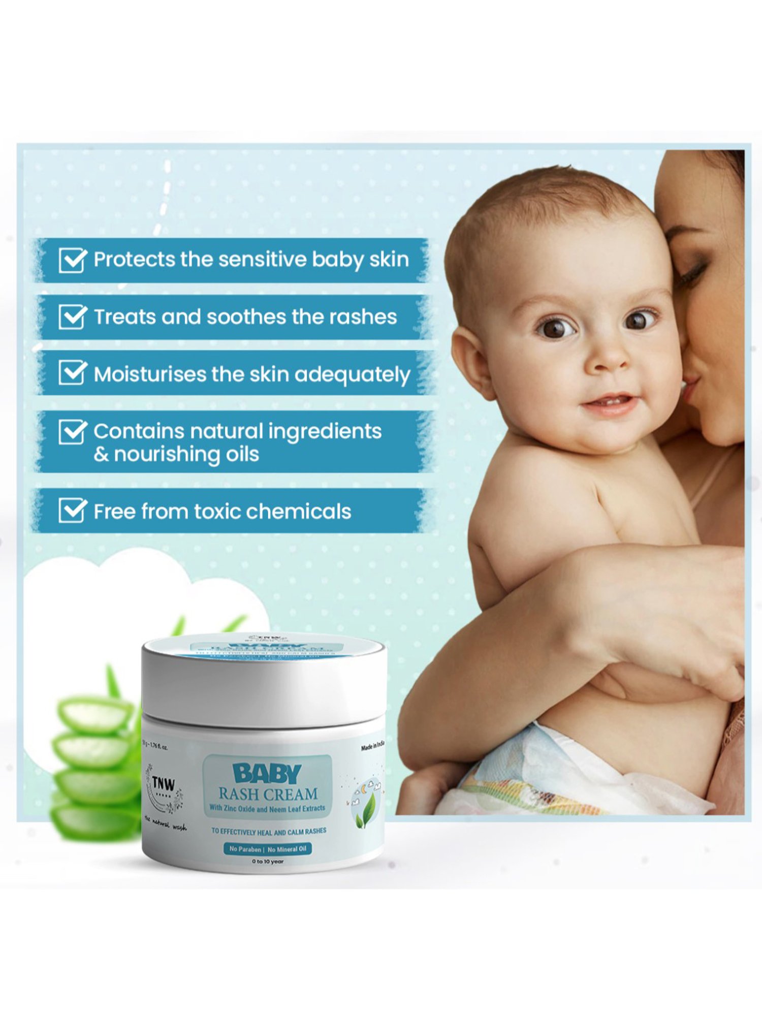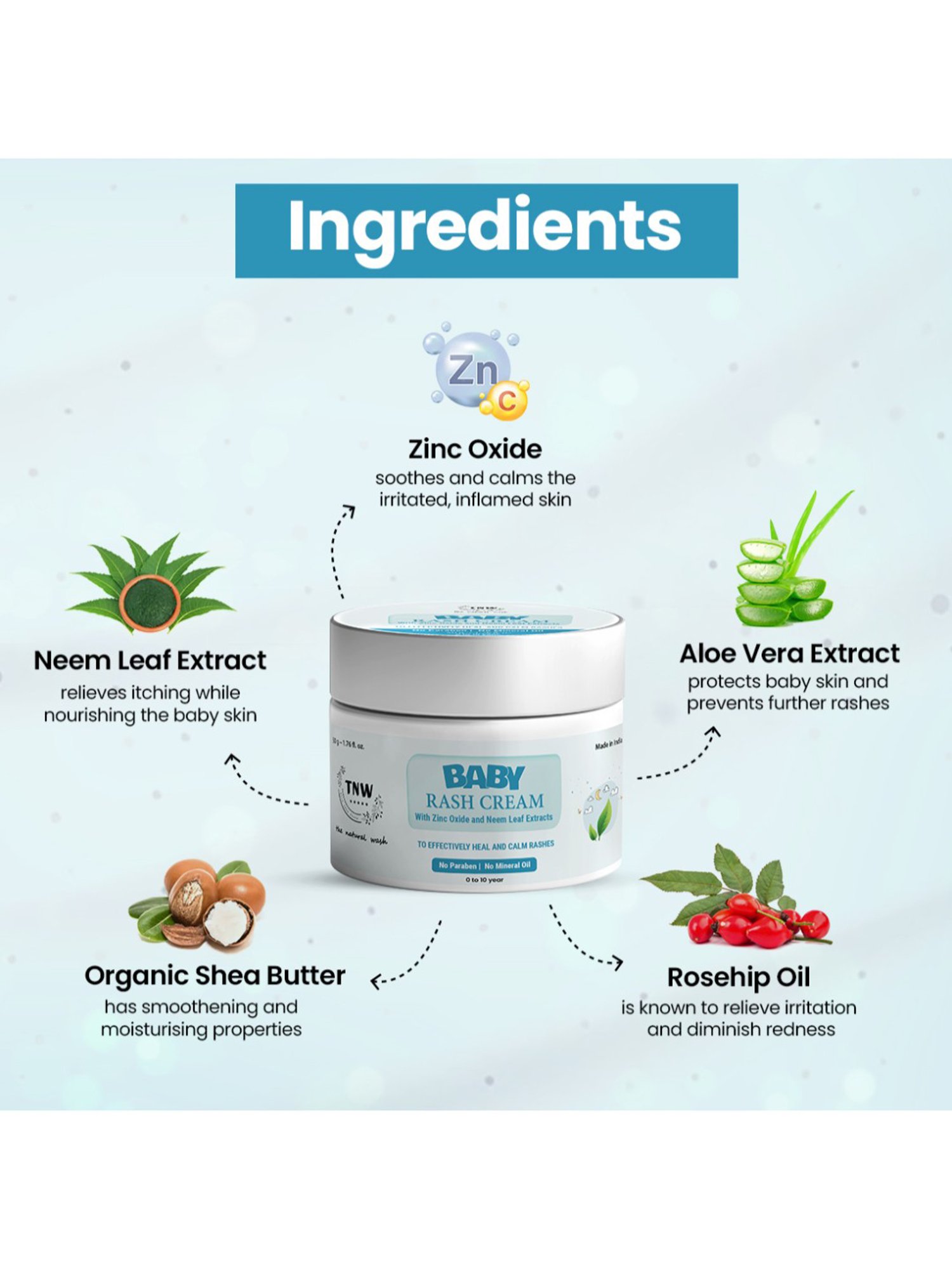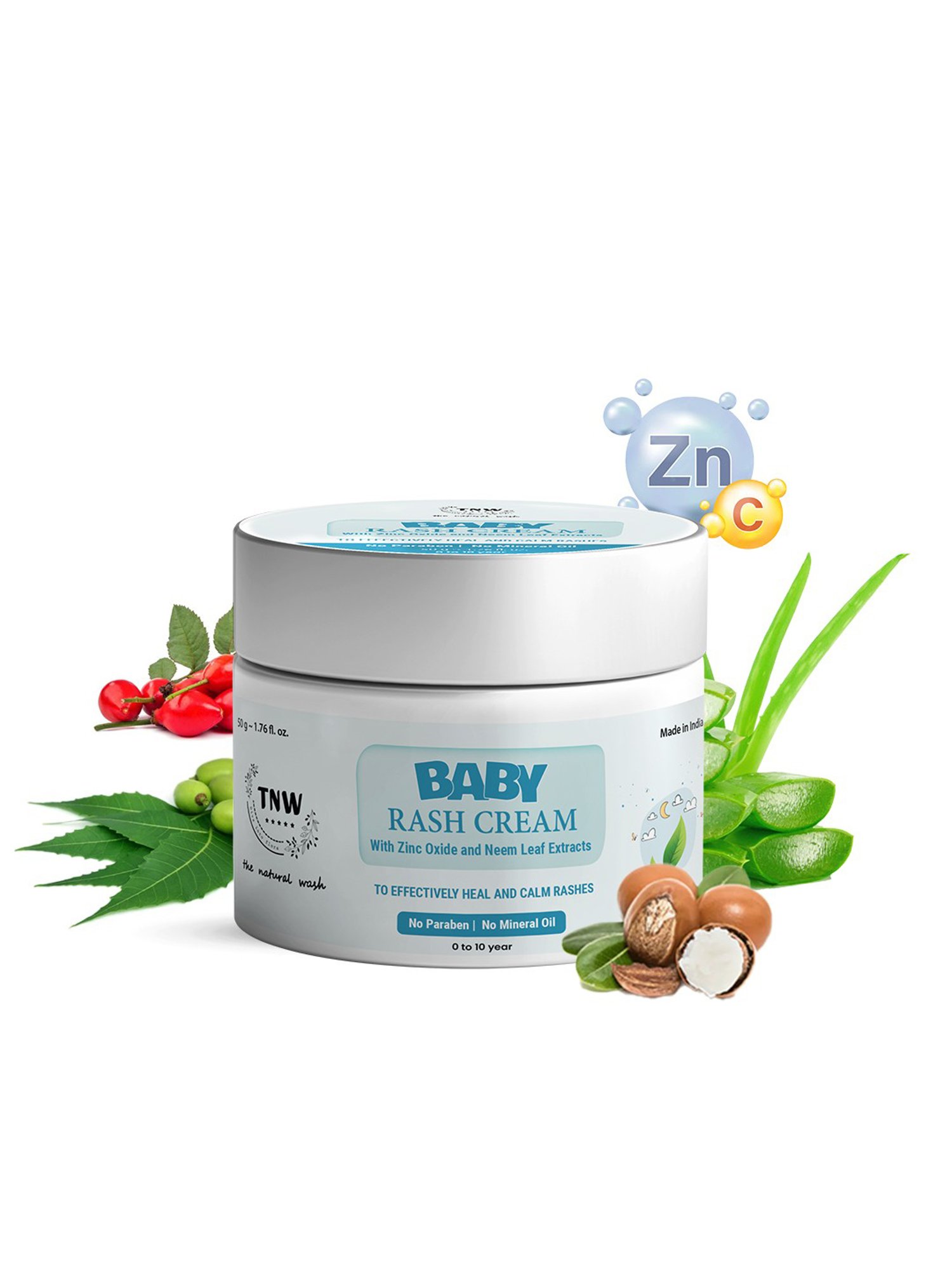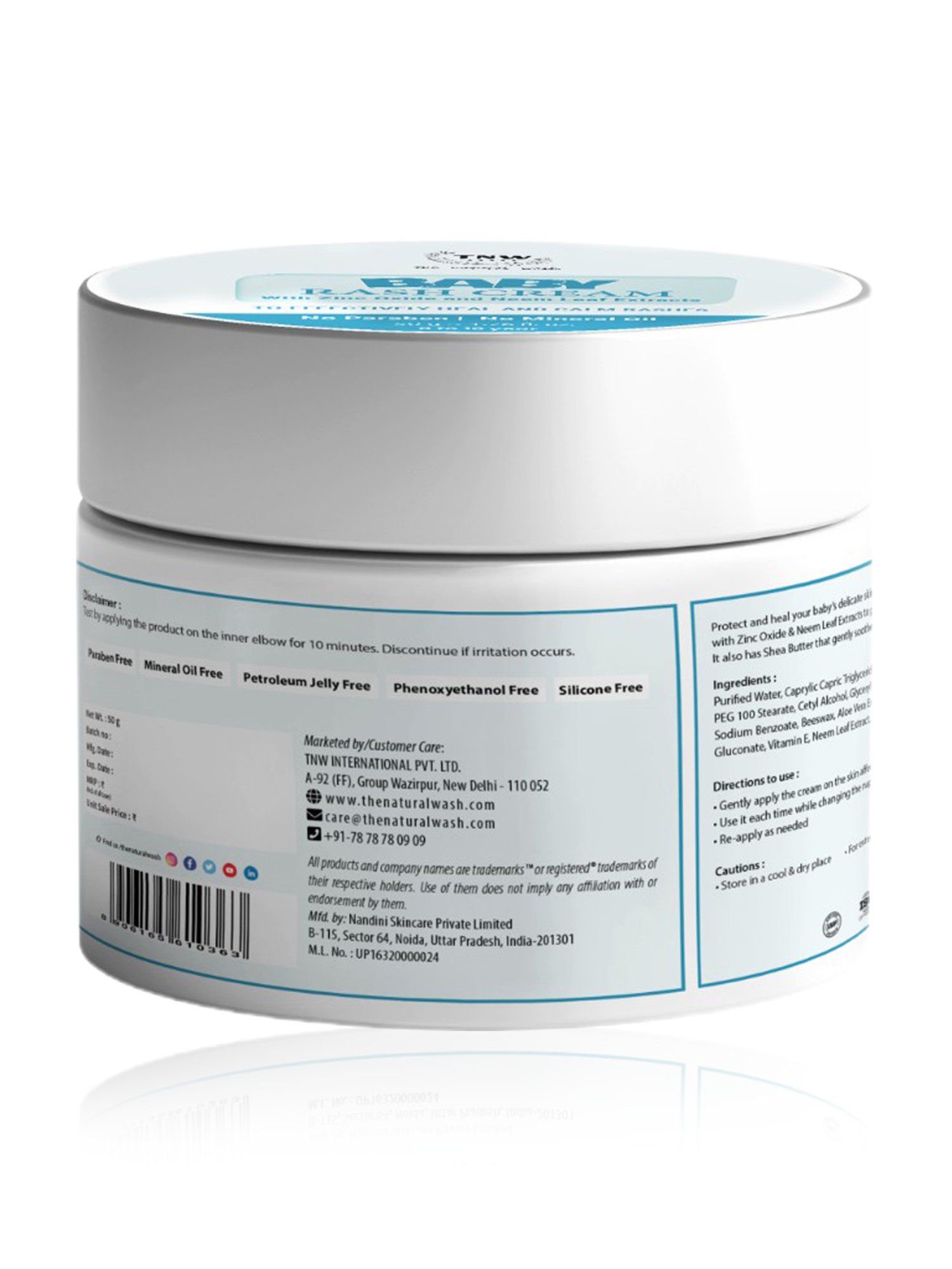TNW-The Natural Wash Baby Rash Cream has a zinc oxide-based formula that forms a protective barrier against diaper rashes. TNW-The Natural Wash Baby Rash Cream contains hand-picked ingredients to shield the baby's skin. This cream has neem leaf that regenerate the baby's skin. It also has anti-inflammatory properties that soothe the rashes. To keep your baby's skin moisturised and away from rashes, this rash cream has a formula that contains powerful moisturisers like shea butter and rosehip oil that give highly nourishing properties to baby's skin making every nappy change comfortable.