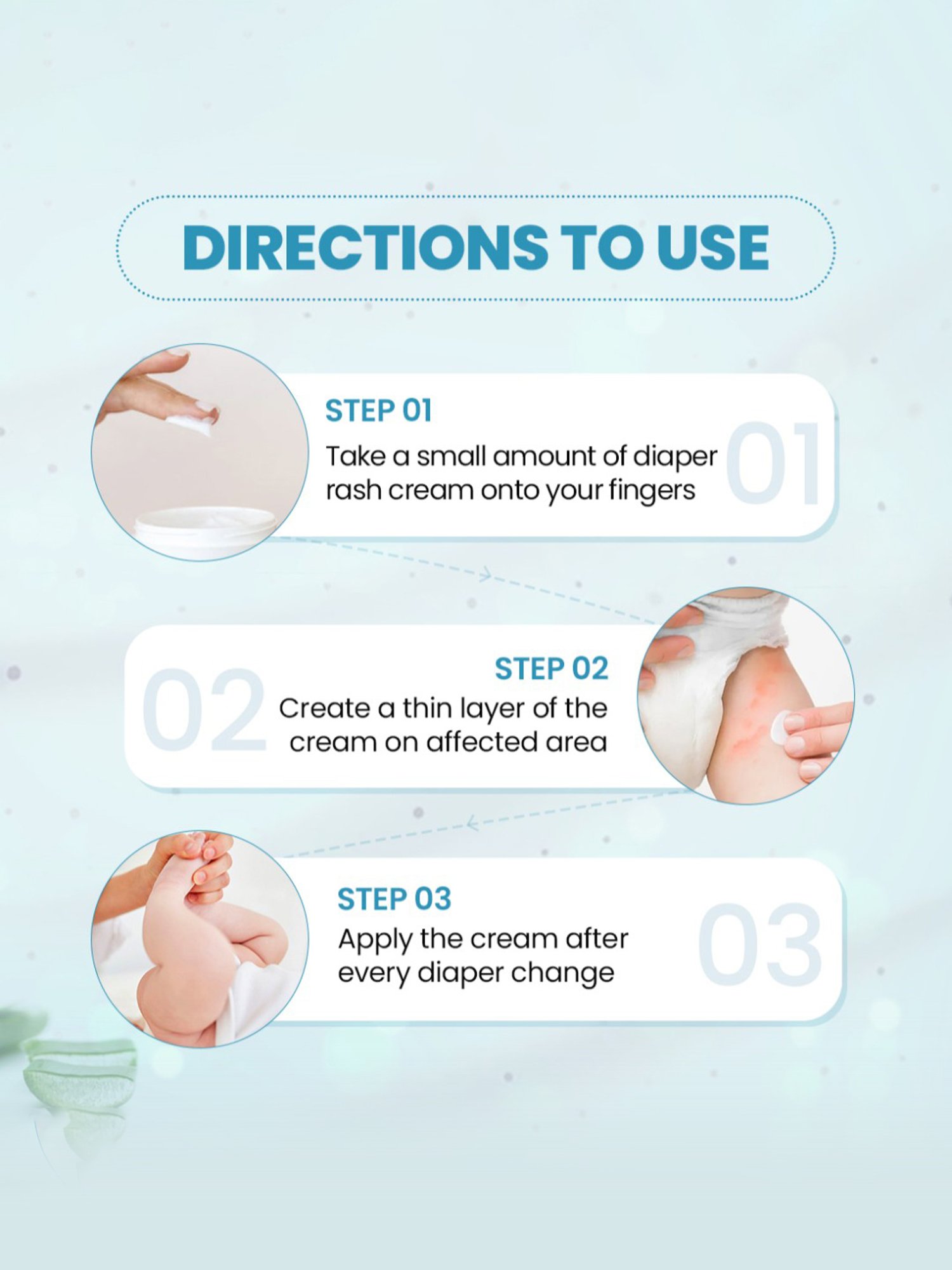 Step 1 - Take a small amount of cream onto your fingers. Step 2 - Create a thin layer of the cream on affected area. Step 3 - Apply the cream after every diaper change. |