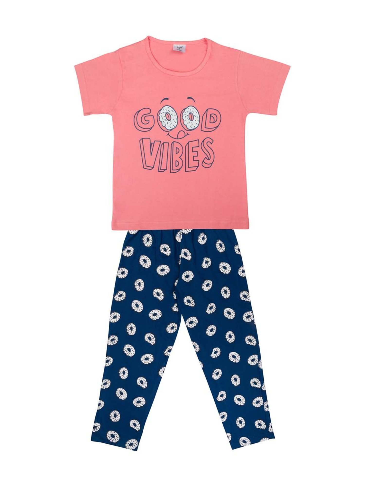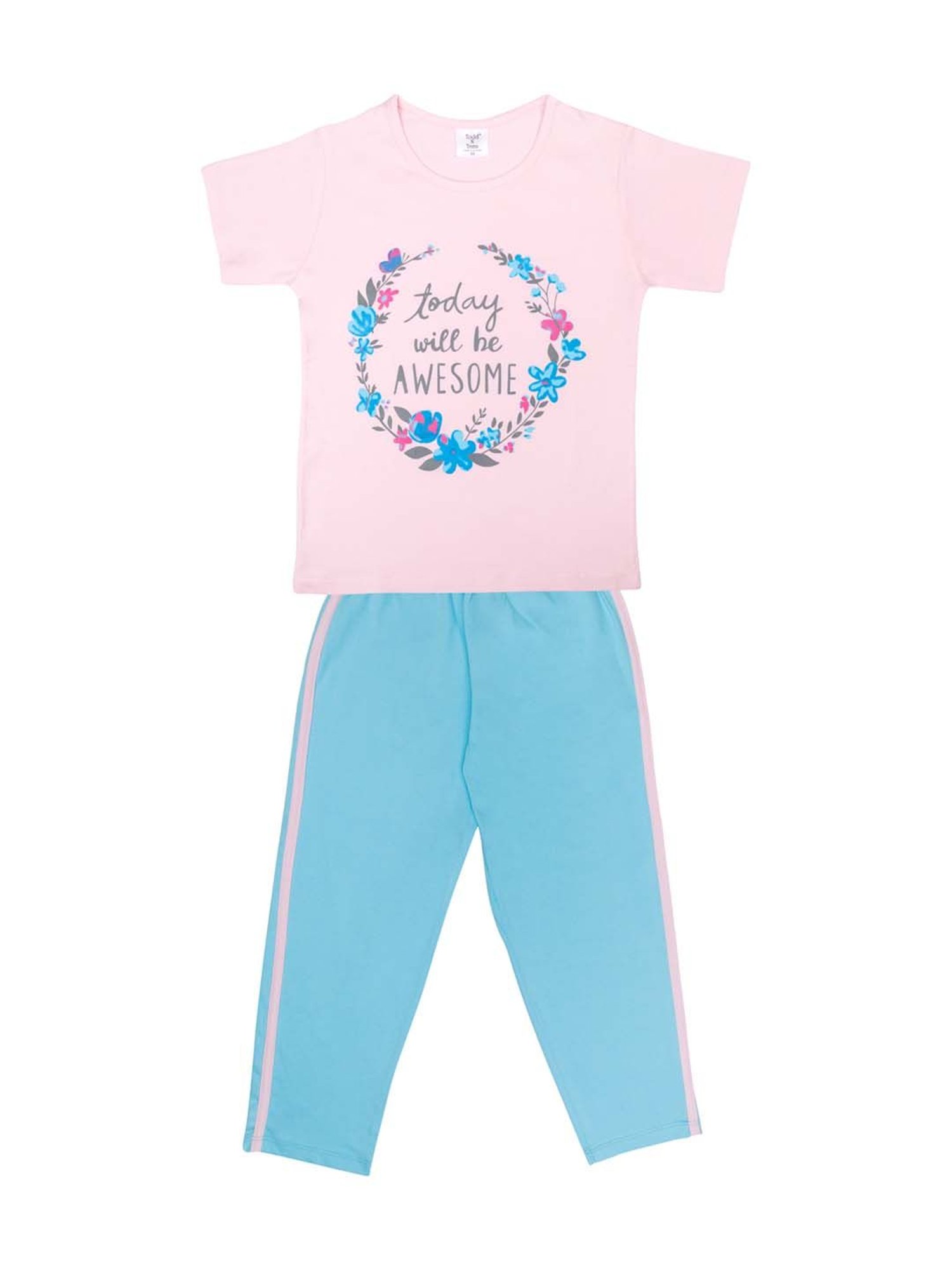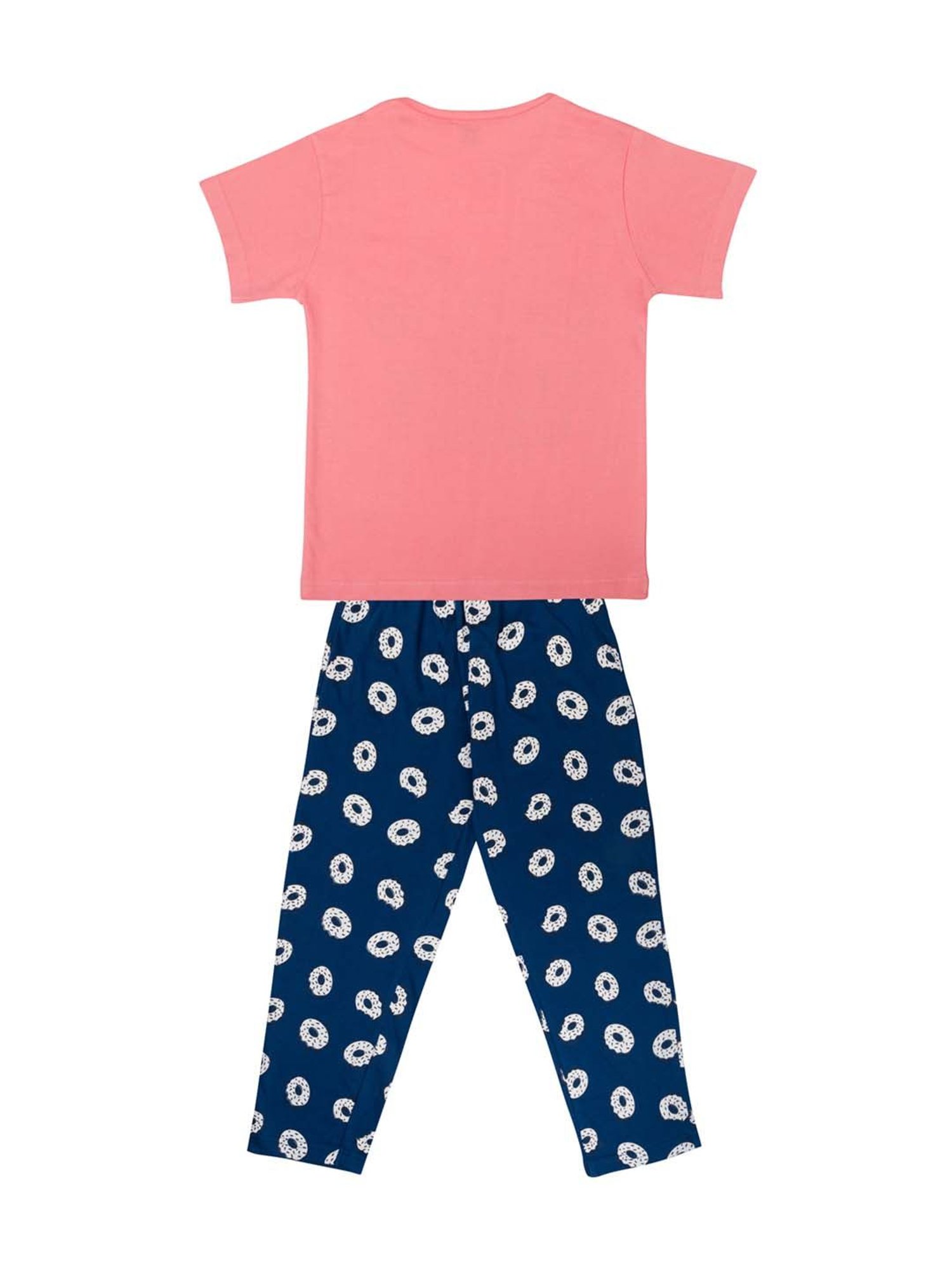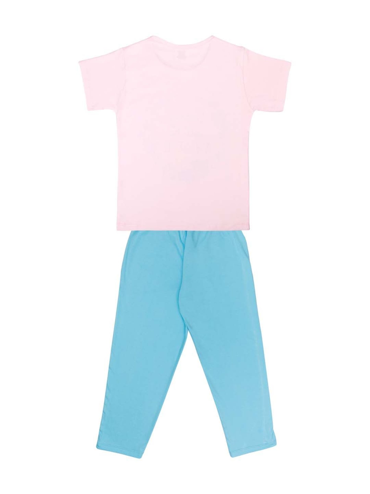 Amplify your little heart's wardrobe with this pink and blue set of 2 t-shirts and pyjamas from Todd N Teen Kids. Tailored to sartorial perfection from premium quality cotton fabric, it assures a soft and soothing touch against the skin. The round neck adds to its appeal. Flaunting half sleeves, it will surely keep your dear updated with the latest trend. The printed pattern makes it a captivating choice. To complete the look, your dear can flaunt it with a pair of sunglasses.