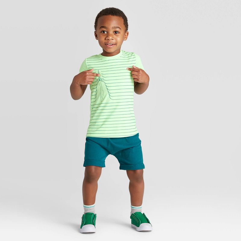He'll be ready to take off when he gets into this Short-Sleeve Rocket Graphic T-Shirt from Cat & Jack™. This toddlers' short-sleeve tee features classic stripes across the torso with a fun twist — a rocket is blasting through them toward the clouds! Crafted with a relaxed fit that will help him move comfortably no matter what his day brings, this light green graphic tee works well with shorts or joggers for everyday play and layers easily under hoodies or jackets for chillier days.