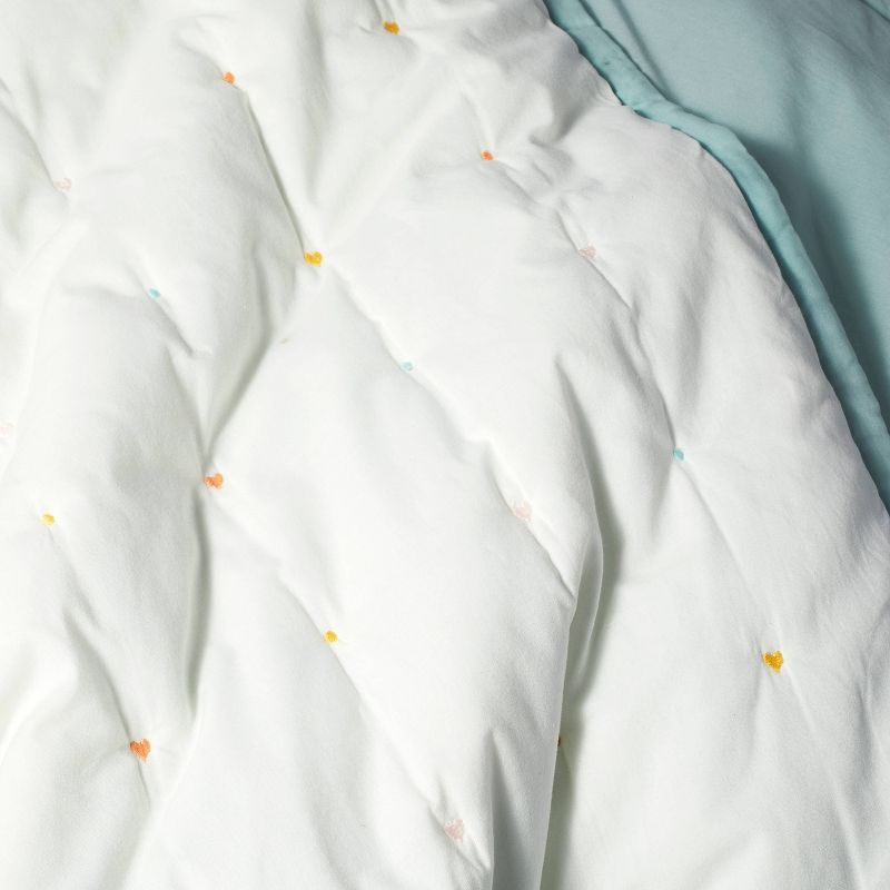 Sweeten your wee one's nursery with the Heart Embroidered Quilt from cloud island™. This toddler quilt is decked out in tiny, embroidered hearts that pop vibrantly from the white background with a lovely, textured look, and it features a soft teal color on the opposite side to complete the endearing design. Made from lightweight 100% cotton upper and backing, the decorative quilt has a comfy filled design for a snuggly night's sleep, and it’s machine-washable for easy care and cleaning. Add coordinating shams, and complete the look with sheets and decorative pillows in your kiddo’s fave colors.