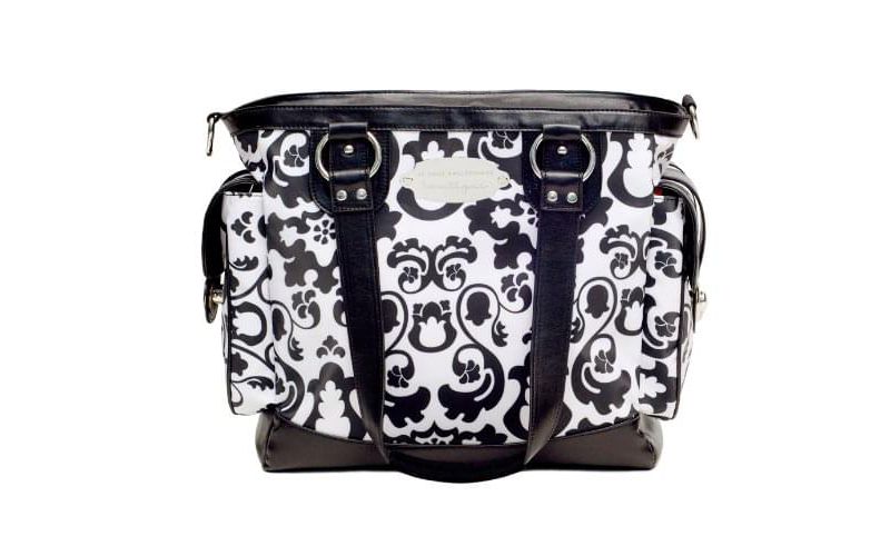 This spacious diaper bag has end pockets, seam taped lining, non-skid tote handles, and a matching changing pad. PVC and Teflon free, this water resistant bag features 5 metal feet on the bottom to prevent scratching. Bag measures 13" W x 10.5" H x 6" D.