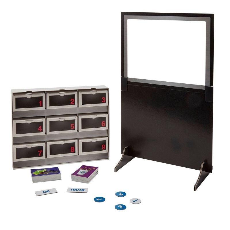 Includes 150 double-sided mystery item cards, 9 numbered mystery boxes, cardboard player divider, Truth tile, Lie tile, 4 Question tokens, 2 plastic clips, and instructions.