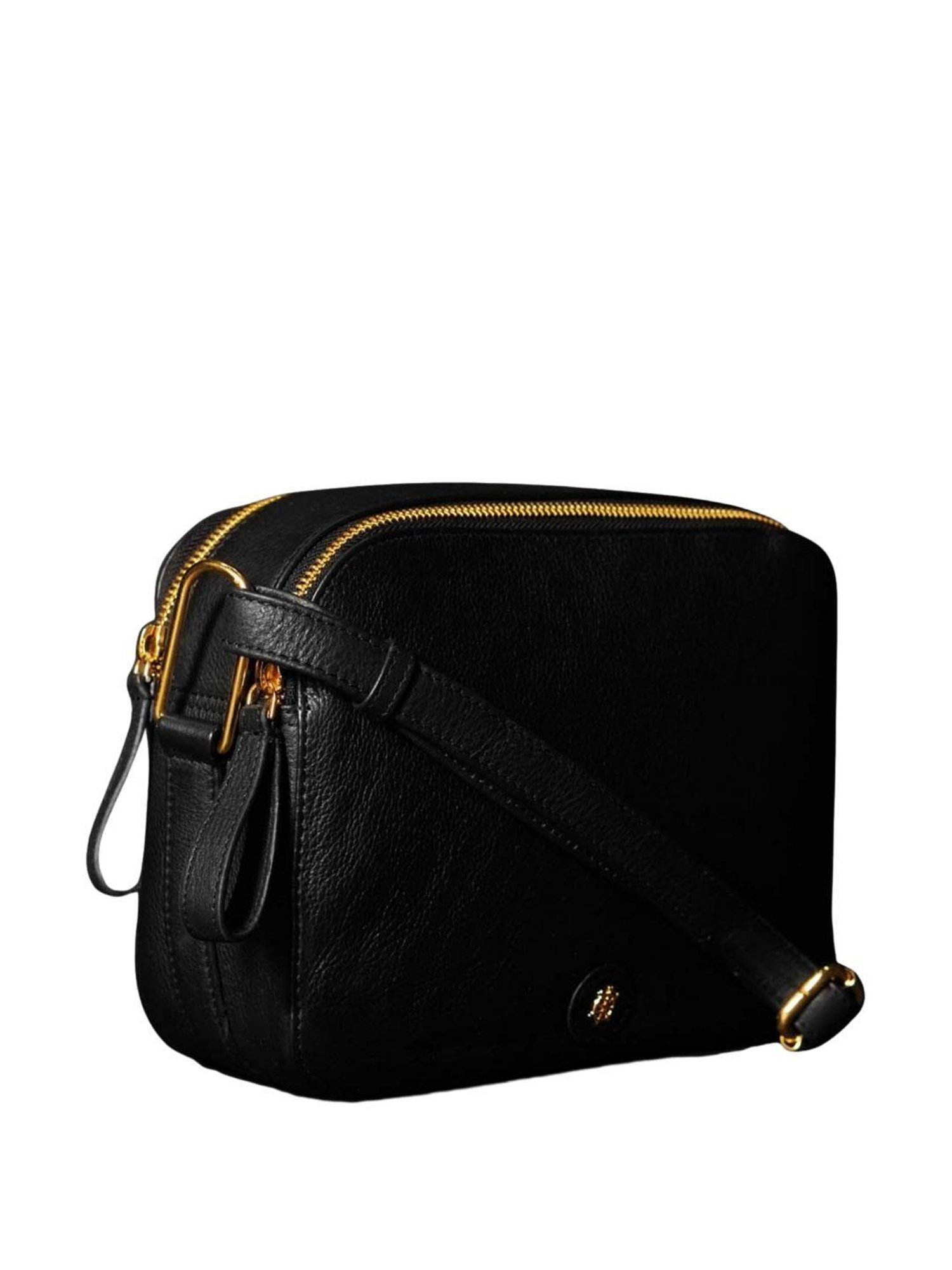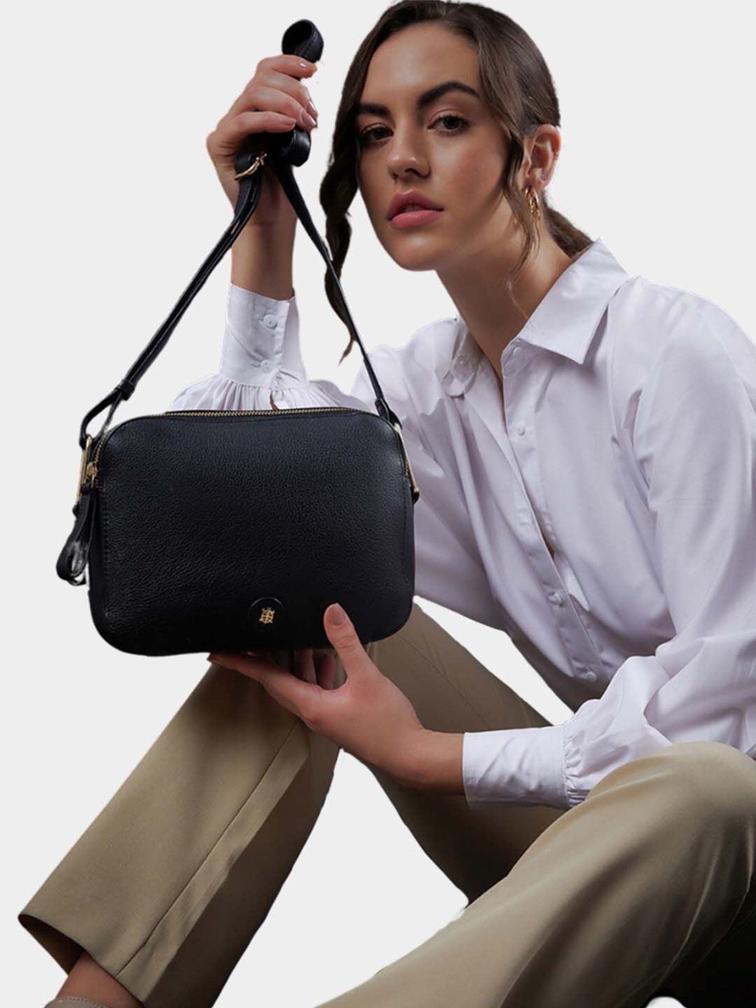 Add a distinct touch to your look with this women's black cross body bag from Tortoise. It features a zip closure that ensures the safety of your belongings. This cross body bag exudes a solid pattern that is sure to impress you. Exuding an urbane feel, it is detailed with spacious compartments to accommodate daily essentials in a safe manner. Made of premium quality leather for durability, this cross body bag has a cross body for carrying comfort.