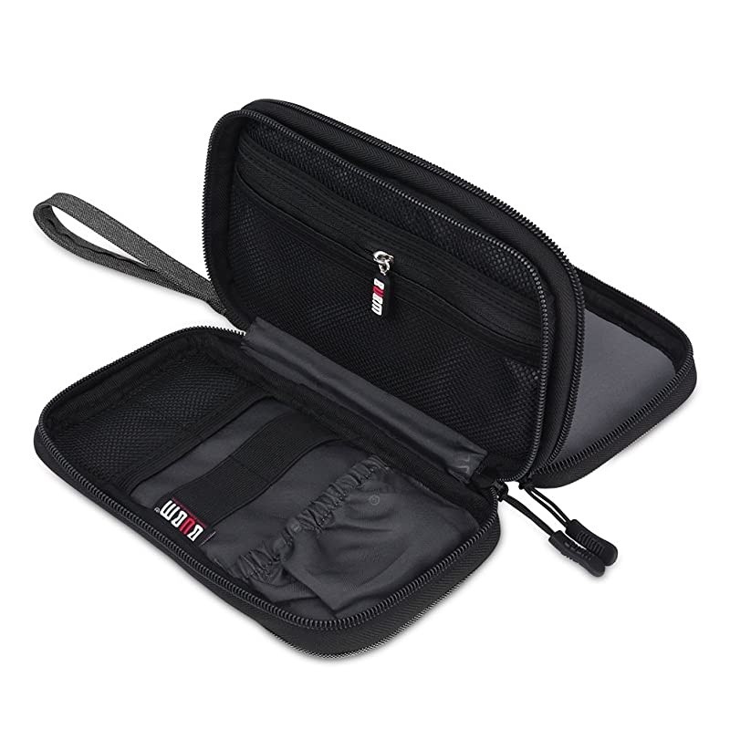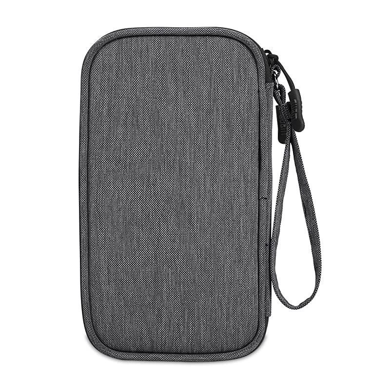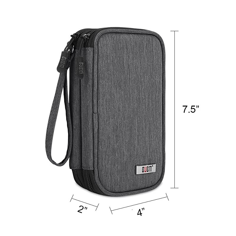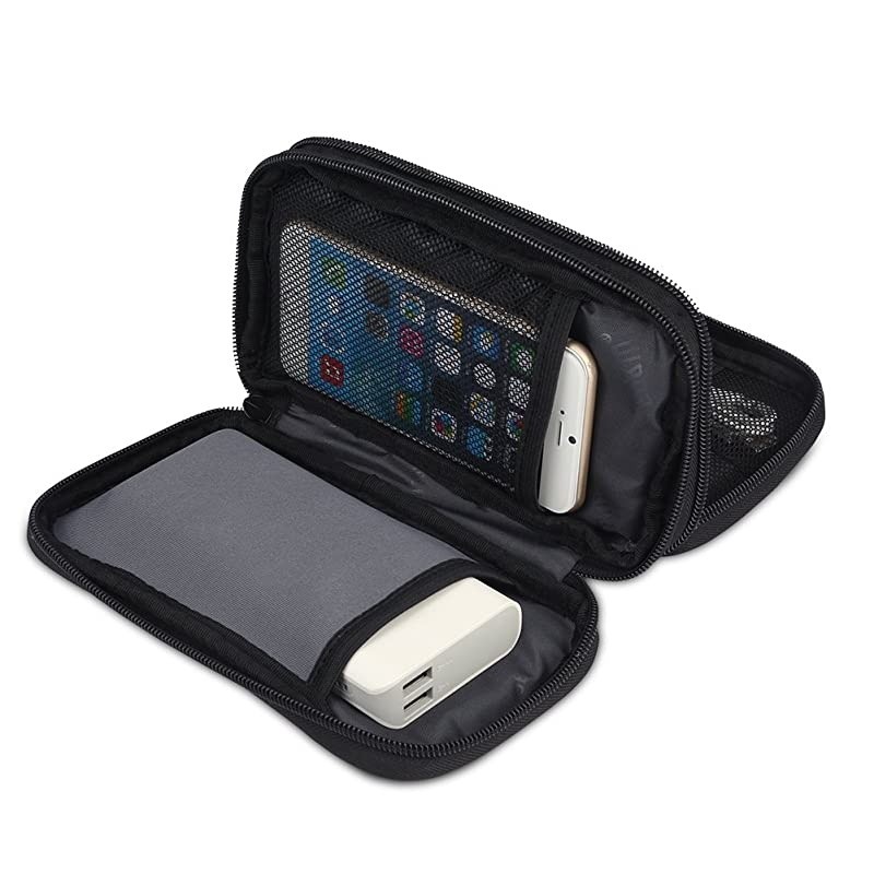 Color: Denim GrayA compact tech bag that you could put your portable power bank, cell phone, various cables and other phone accessories. MULTIFUNCTION STORAGEInterior features multiple pockets and elastic bands to store daily essentials and phone accessories. First Layer 2 elastic loops and 1 open pocket for storing cables and earphones. 2 small mesh pockets expand to store SD cards or flash drives. A zipper mesh pocket for keeping wall charger, cables and other phone accessories. Second Layer 1mesh pocket with elasticated top can fit a cell phone. (up to 6.5 inches) 1 padded pocket can store a power bank. (up to 6.5 inches) MORE DETAILS 2 metal zippers with nylon cord zipper pulls provide a better feel and make less noise. A handle for easy carrying.