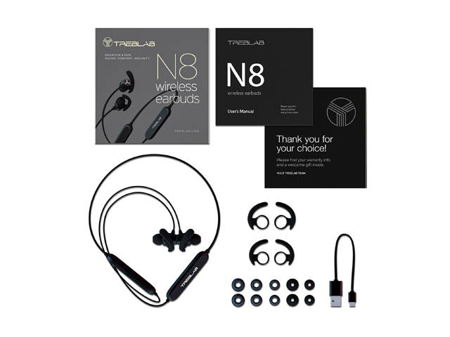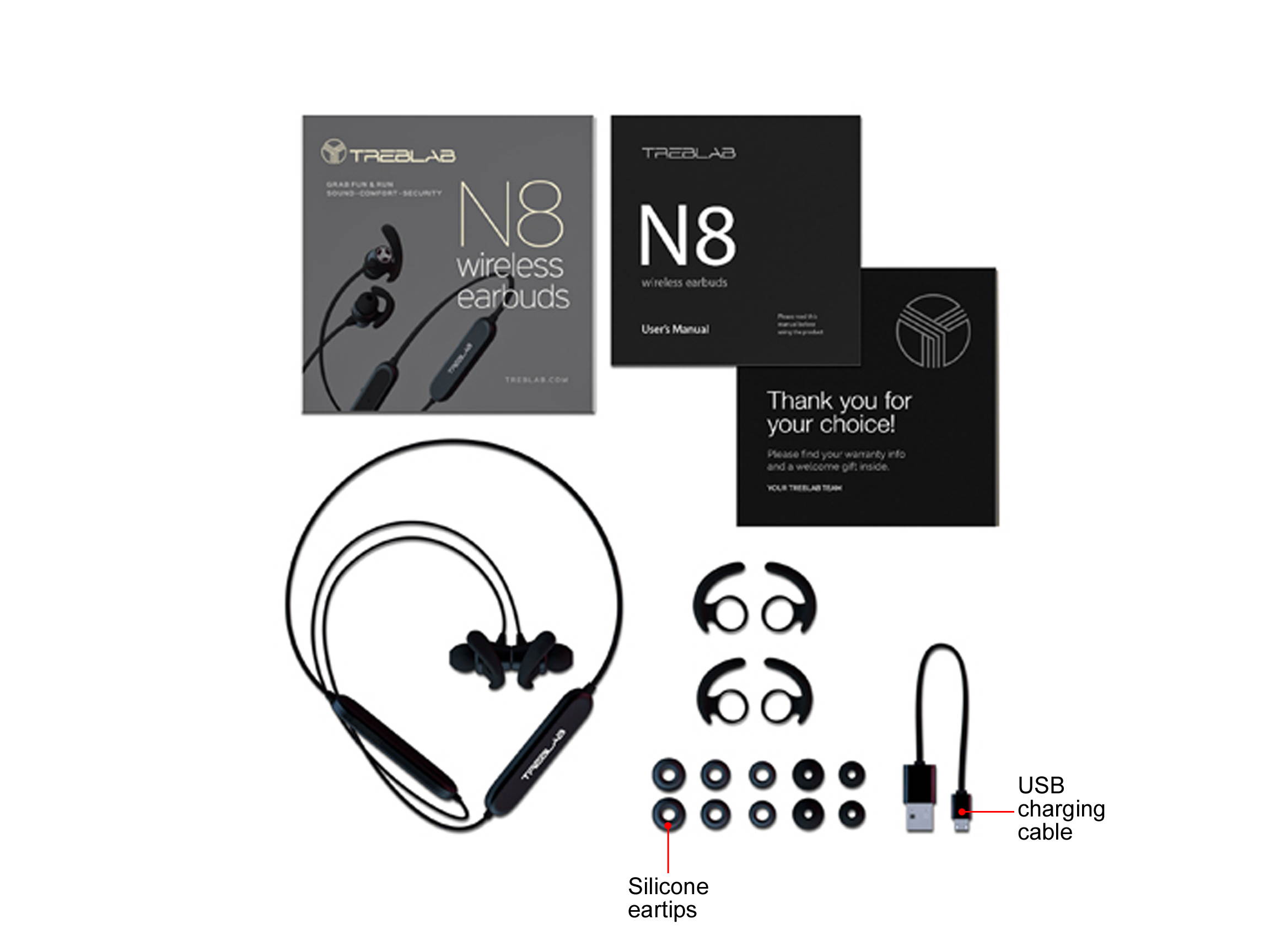 EARPHONES THAT MAKE WORKING OUT EASY - TREBLAB N8 earbuds are designed to fit perfectly in your ear, whatever you're doing, wherever you're doing it. They're IPX5 waterproofed against sweat and rain, so you can keep on working out as hard as you like in any weather. They come with multiple eartips and ear fins, so you can get the perfect fit for your ear, meaning they stay in when you're running, jumping or kicking.