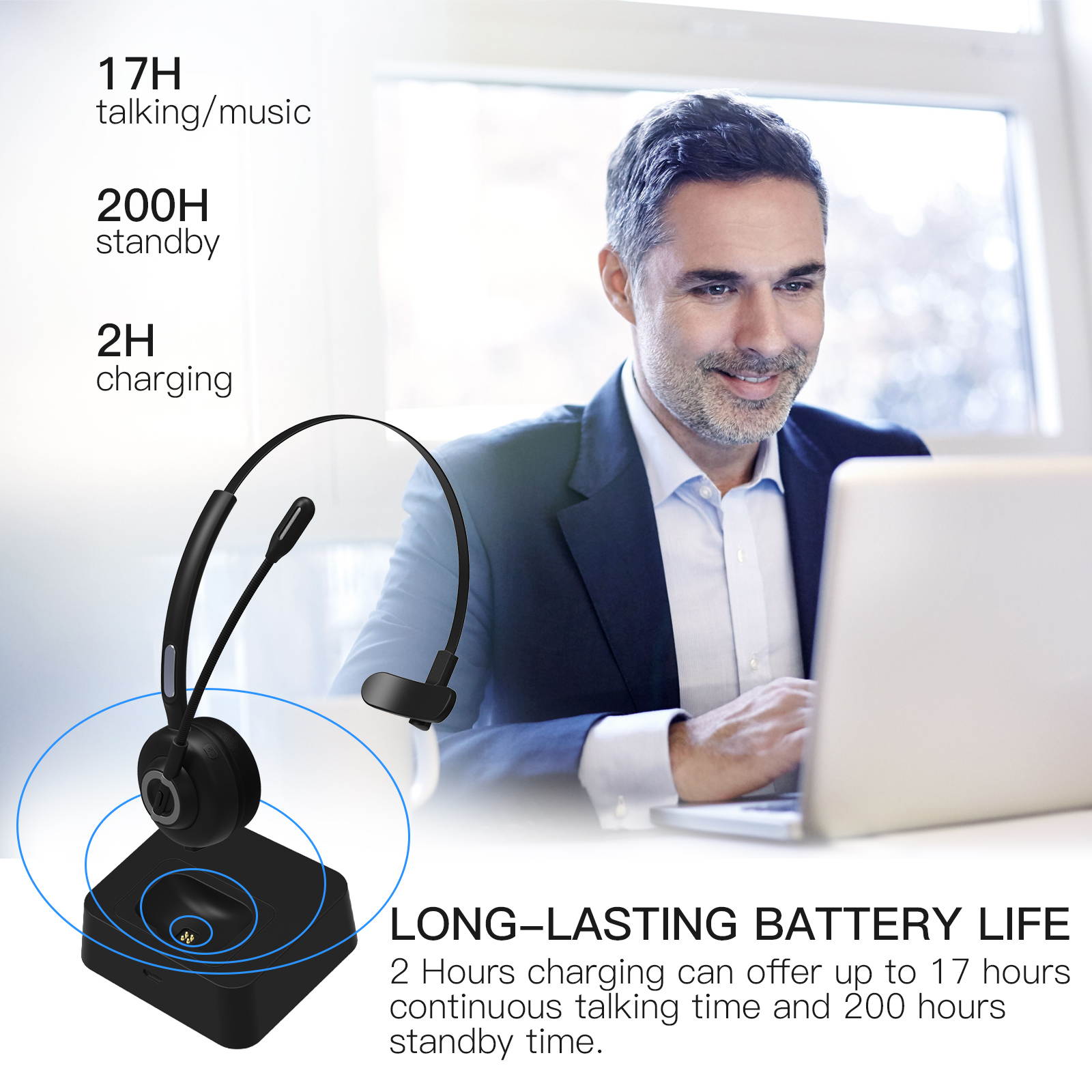 Wireless Talk User into the new era of wireless talk with Bluetooth headphones – perfect for making wireless phone calls, video calls, skype conference and more.
