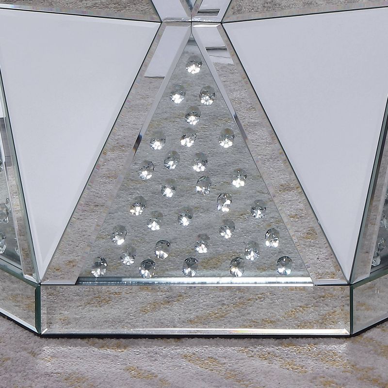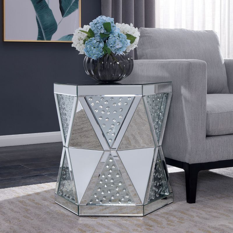 Indulge in an artisan bent on industrial interior design with a piece that sets conventional standards on their edge. Made to command attention, this Turner Mirrored End Table sets the stage for a dramatic room design. Embrace a sleek concave geometric silhouette as it adds a fashionable contemporary attitude and personal style. A faceted base decked out in acrylic accents, tempered glass panels, and mirrored panels makes this a truly eye catching piece that reshapes a modern space.